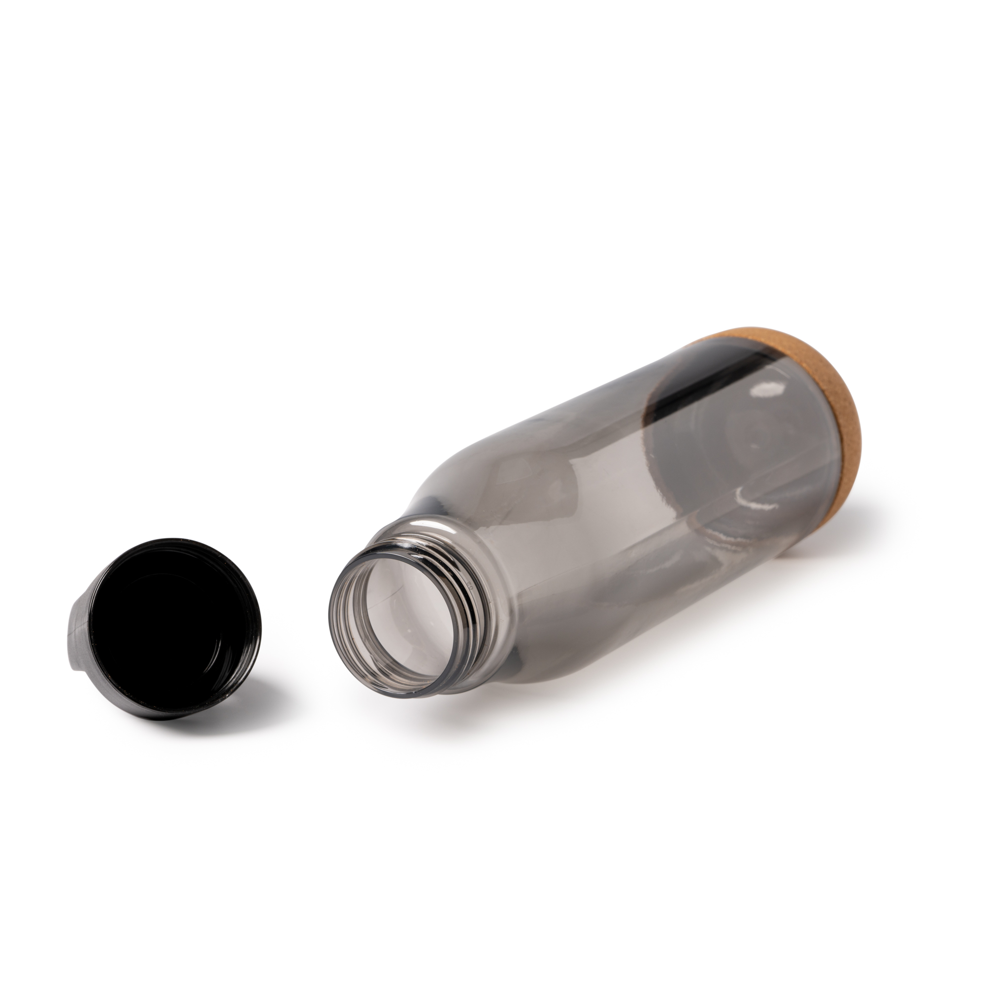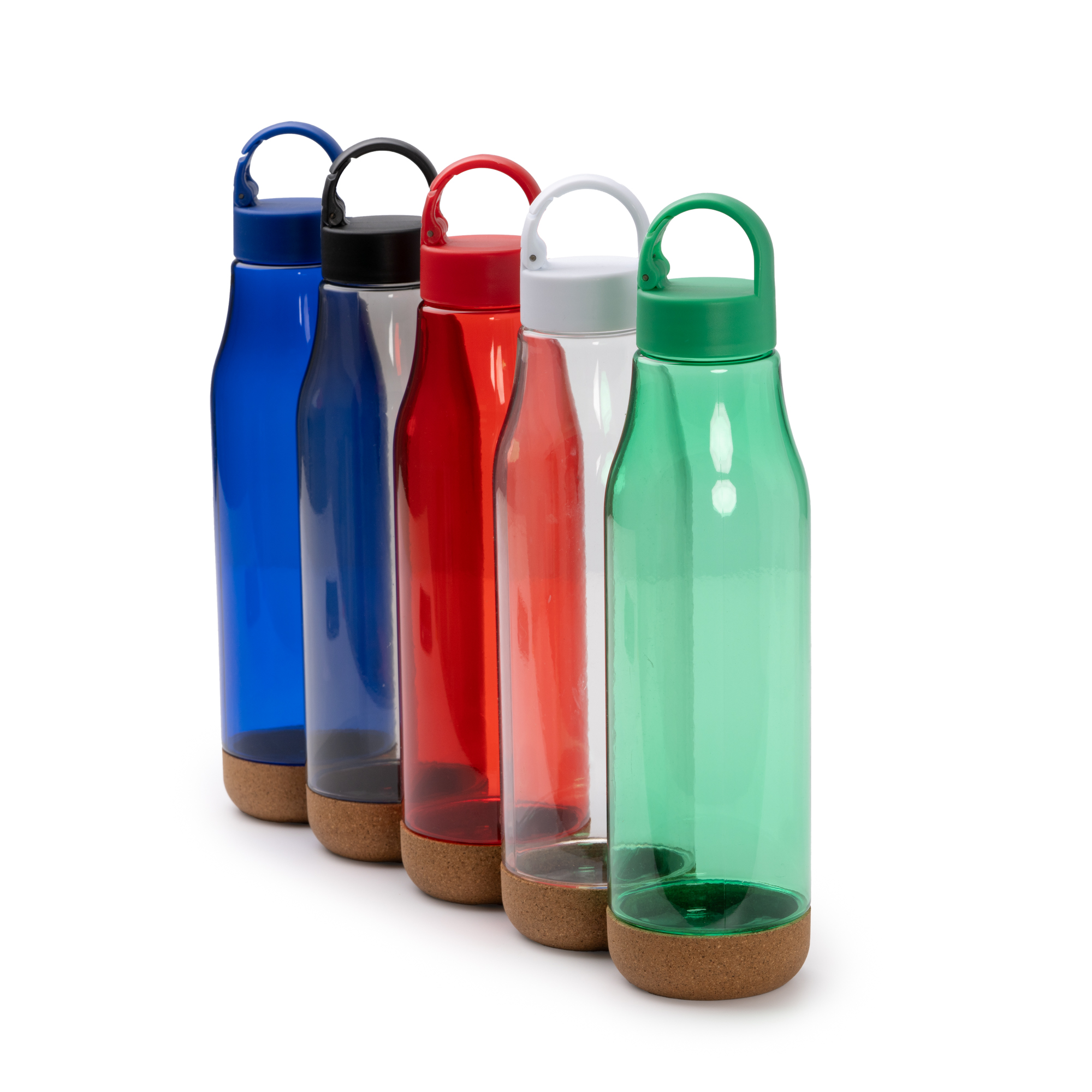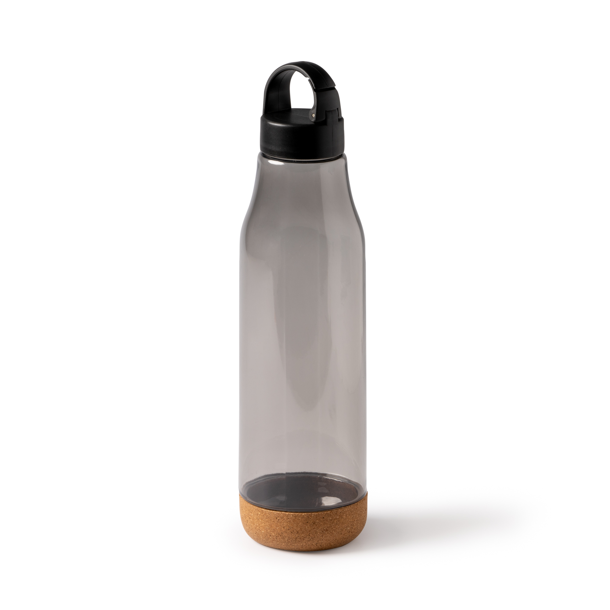 Bouteille avec corps en RPET et base en liège. Poignée de transport avec un mousqueton sur le couvercle. Capacité : 720 ml Présentation en boîte éco-conception.