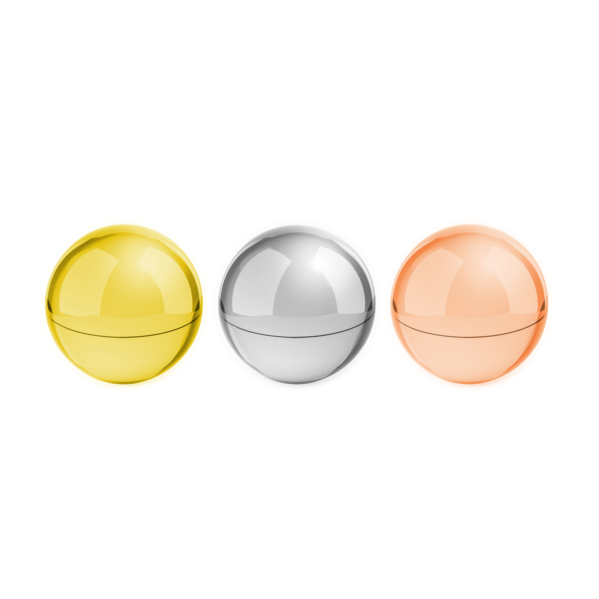 Baume à lèvres présenté dans un étui design de type sphère avec une finition chromée. Protection SPF15.
