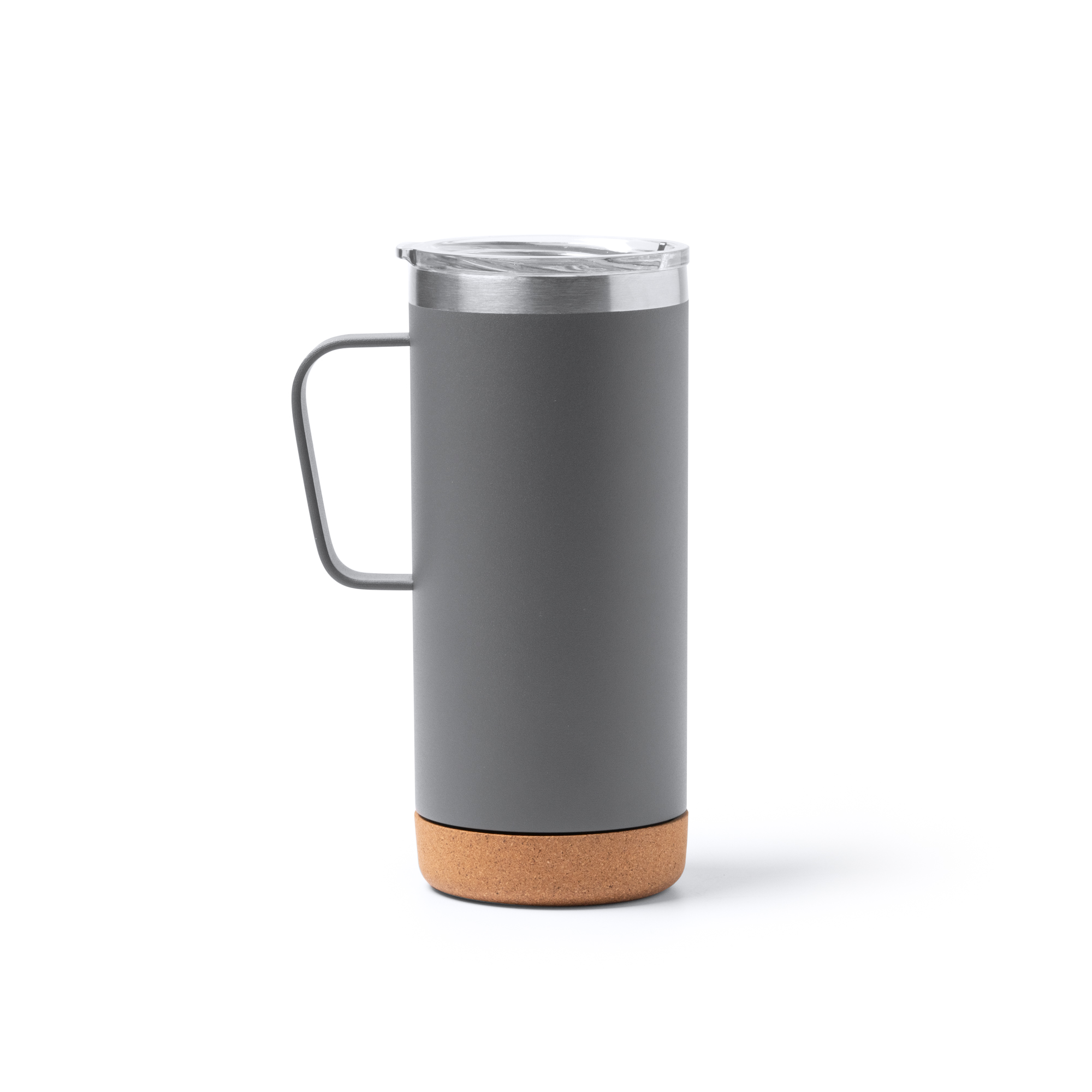 Mug en acier inoxydable recyclé à double paroi avec base en liège et couvercle de sécurité transparent. Capacité de 600 ml.