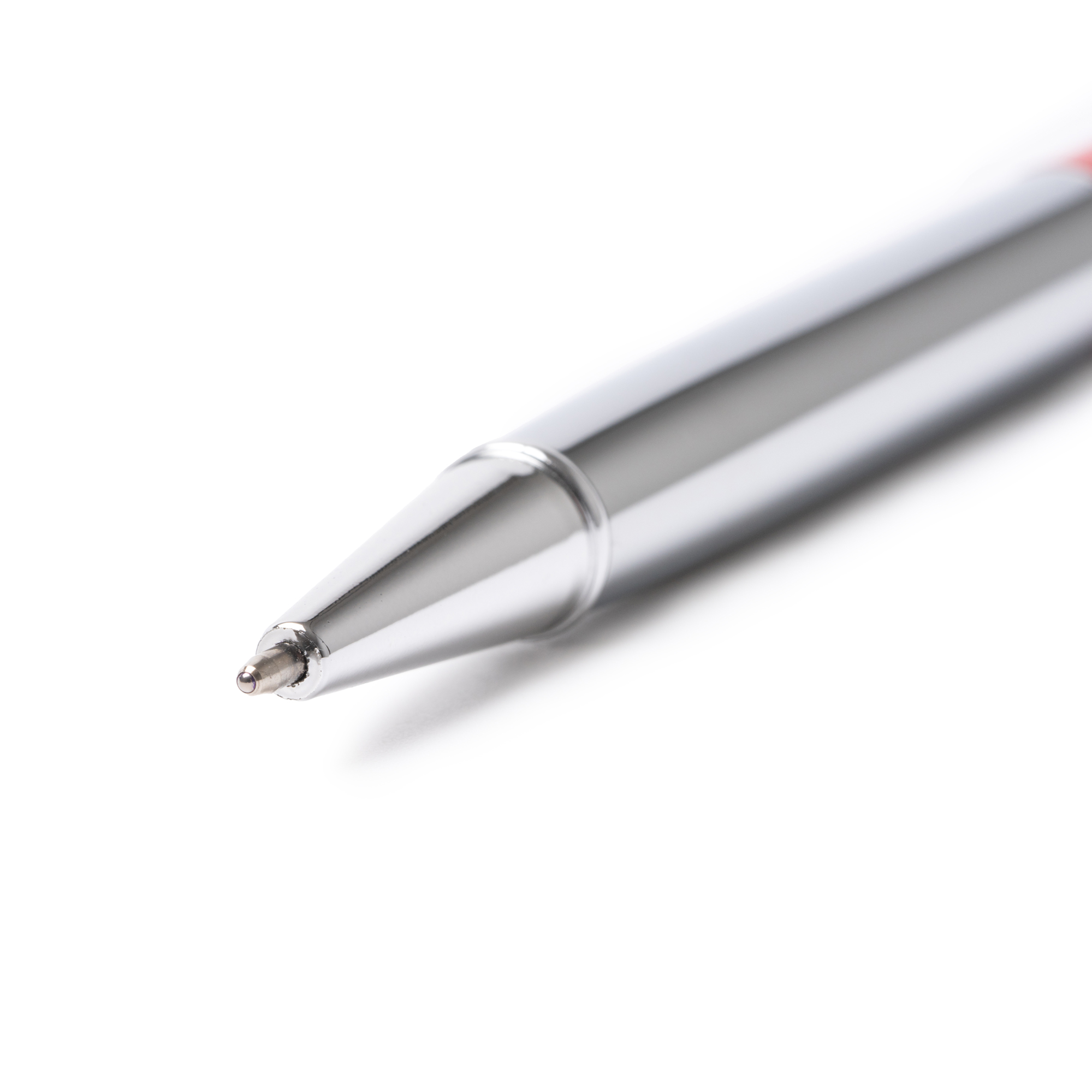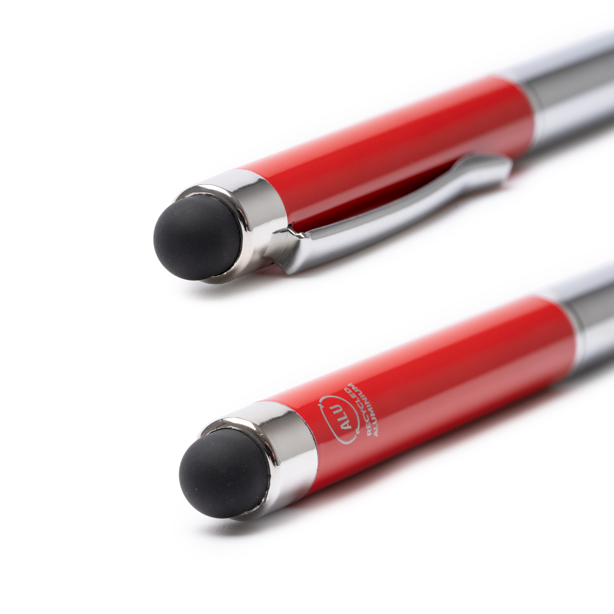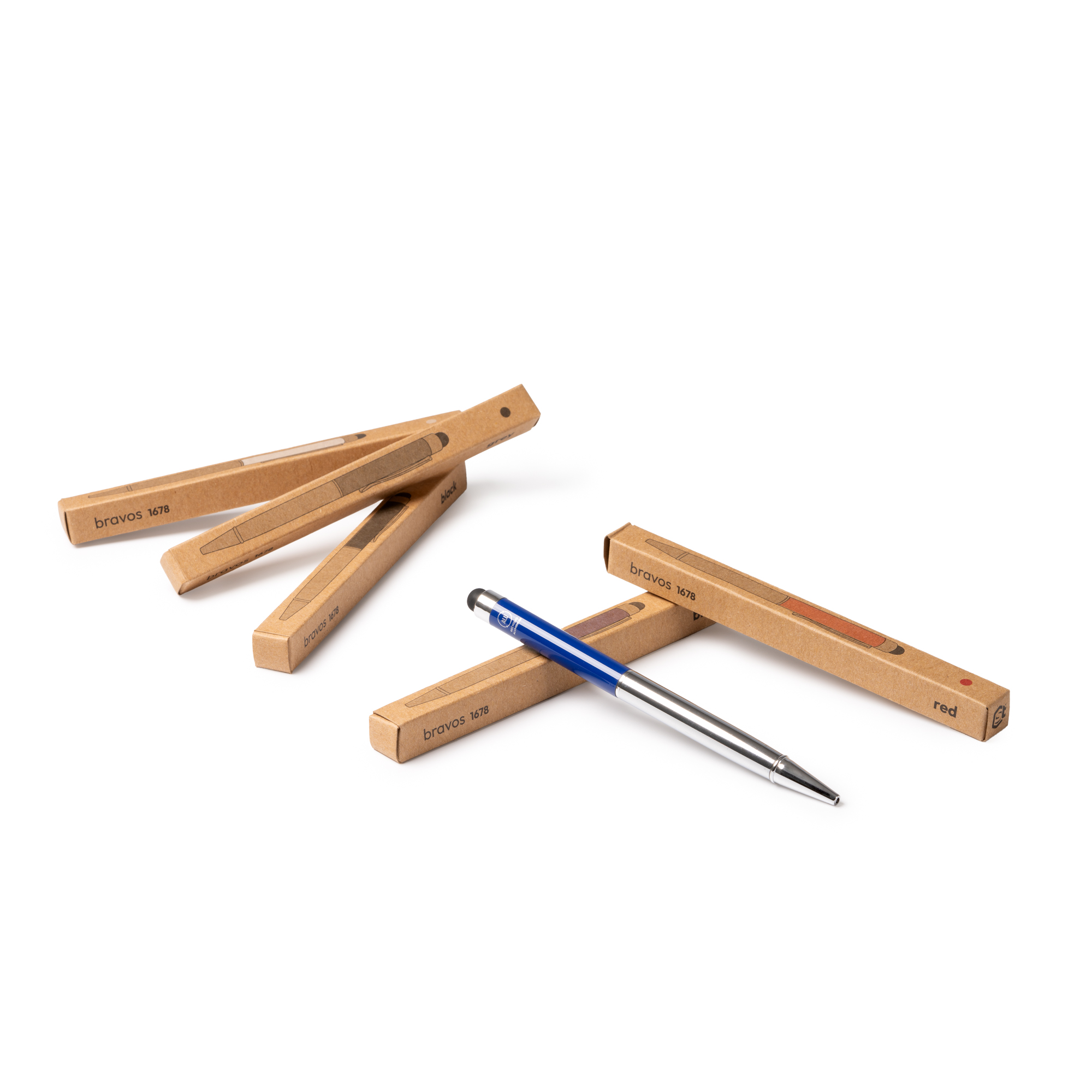 Stylo à bille avec corps en aluminium recyclé et aiguille tactile. Pointe et clip en métal chromé. Recharge d’encre jumbo en bleu métallisé. Présentation en boîte conception kraft.