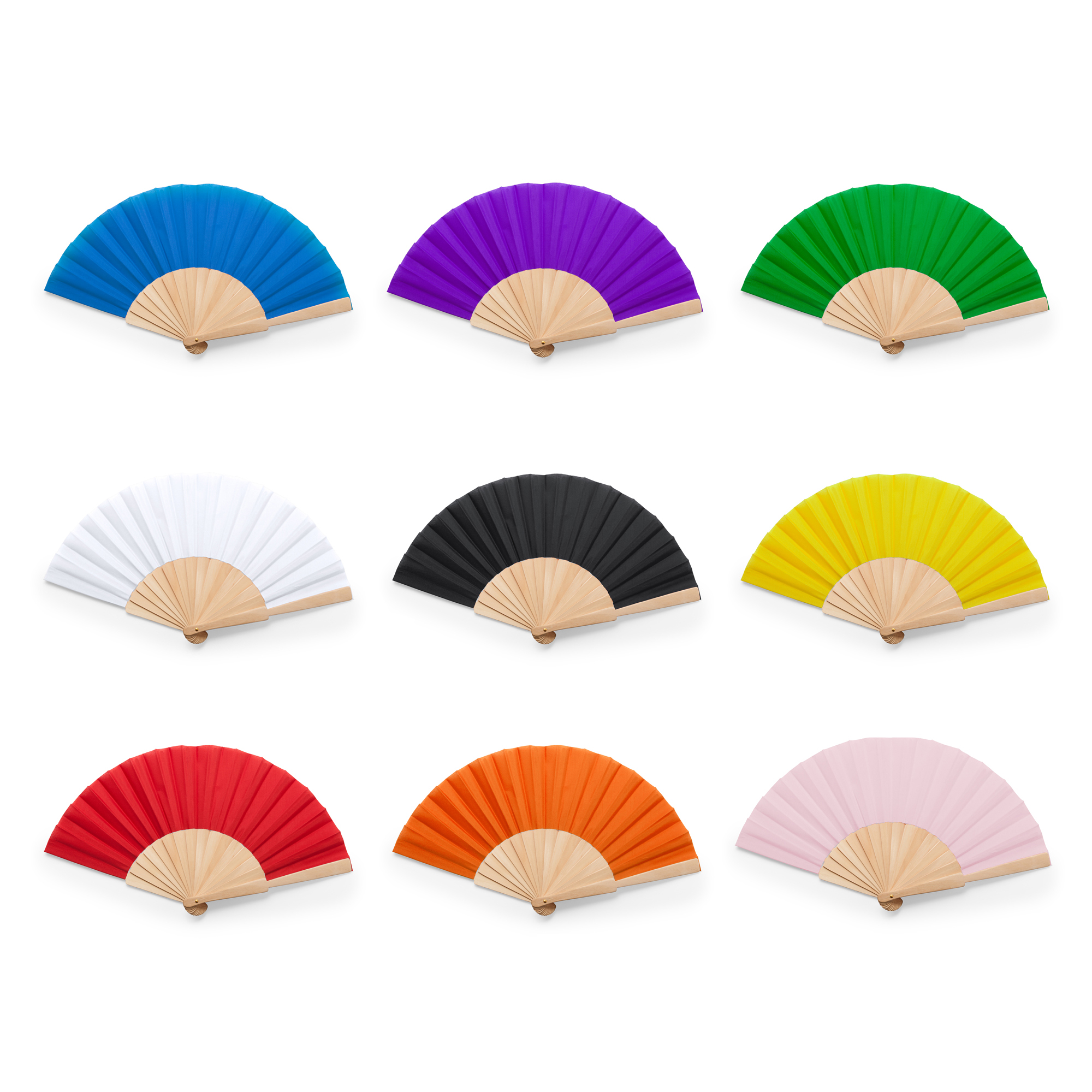 Éventail avec armature en bois et tissu polyester. Présentation en boîte blanche.
