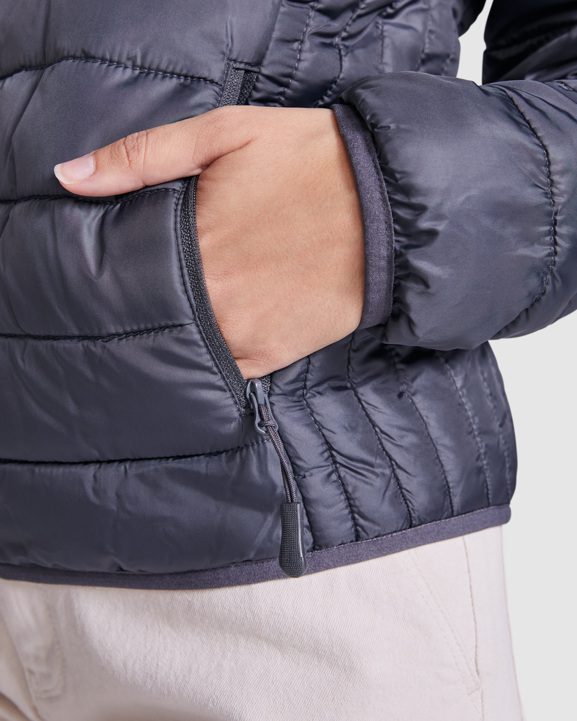 Veste matelassée imperméable. Fermeture à glissière avant inversée ton sur ton avec protège-menton du même tissu. Poches latérales avec fermetures à glissière inversées placées dans des empiècements latéraux façonnés pour un ajustement plus ajusté sur la poitrine. Poignets et ourlet élastiqués ton sur ton. Option de couleurs unies ou contrastées pour la doublure.