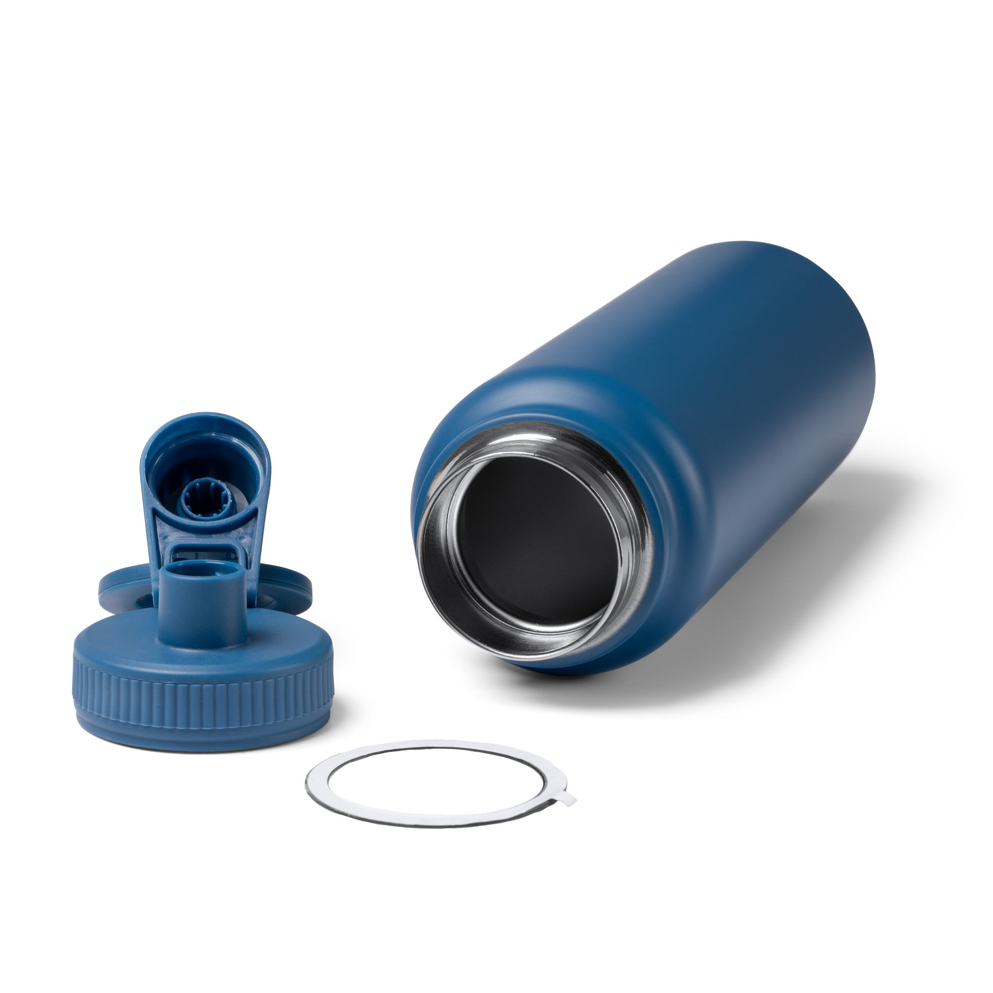 Bouteille isotherme à double paroi en acier inoxydable 304 recyclé avec couvercle avec anneau magnétique pour support de téléphone portable. Caoutchouc antidérapant sur la base. Capacité : 1L. Présentation en boîte éco-conception.