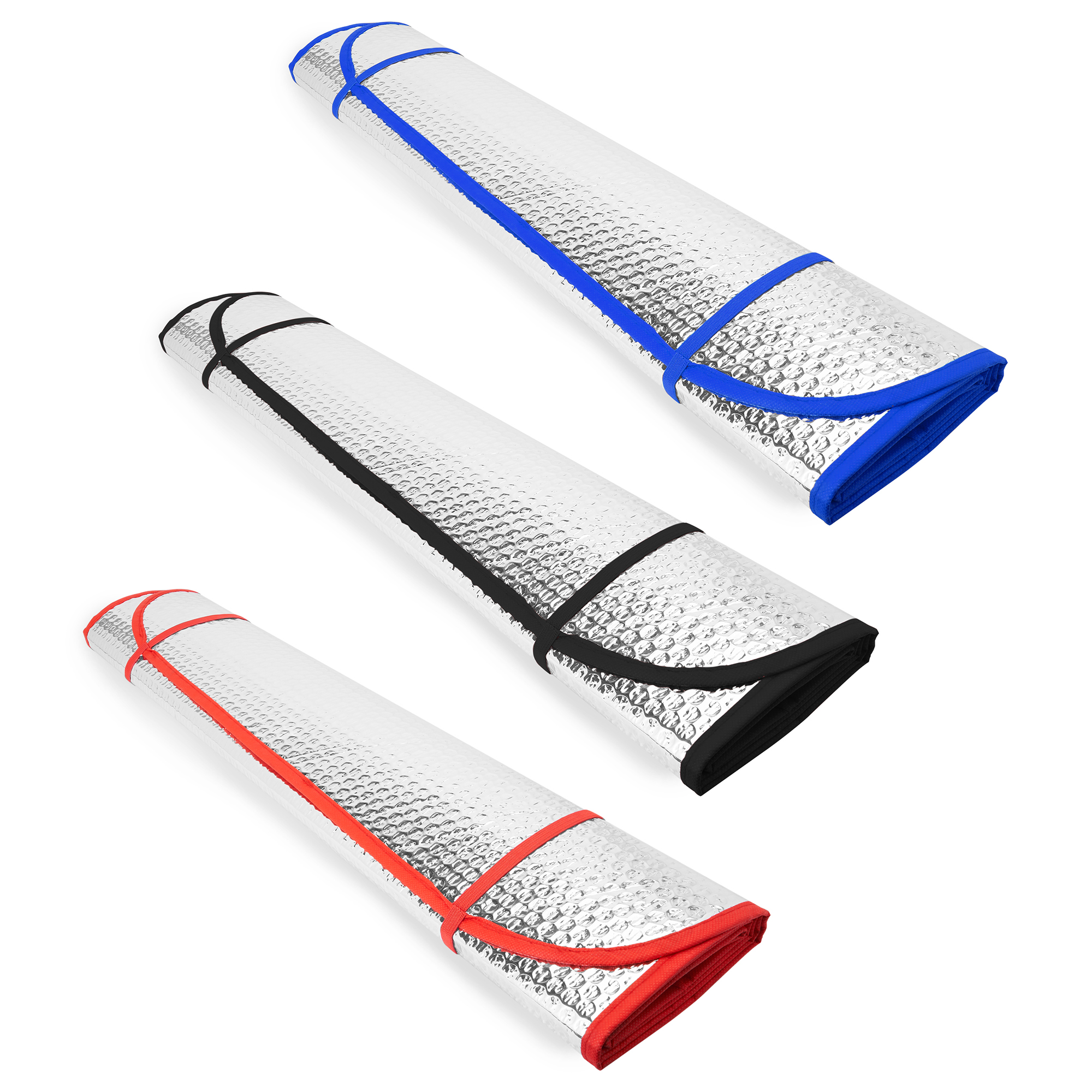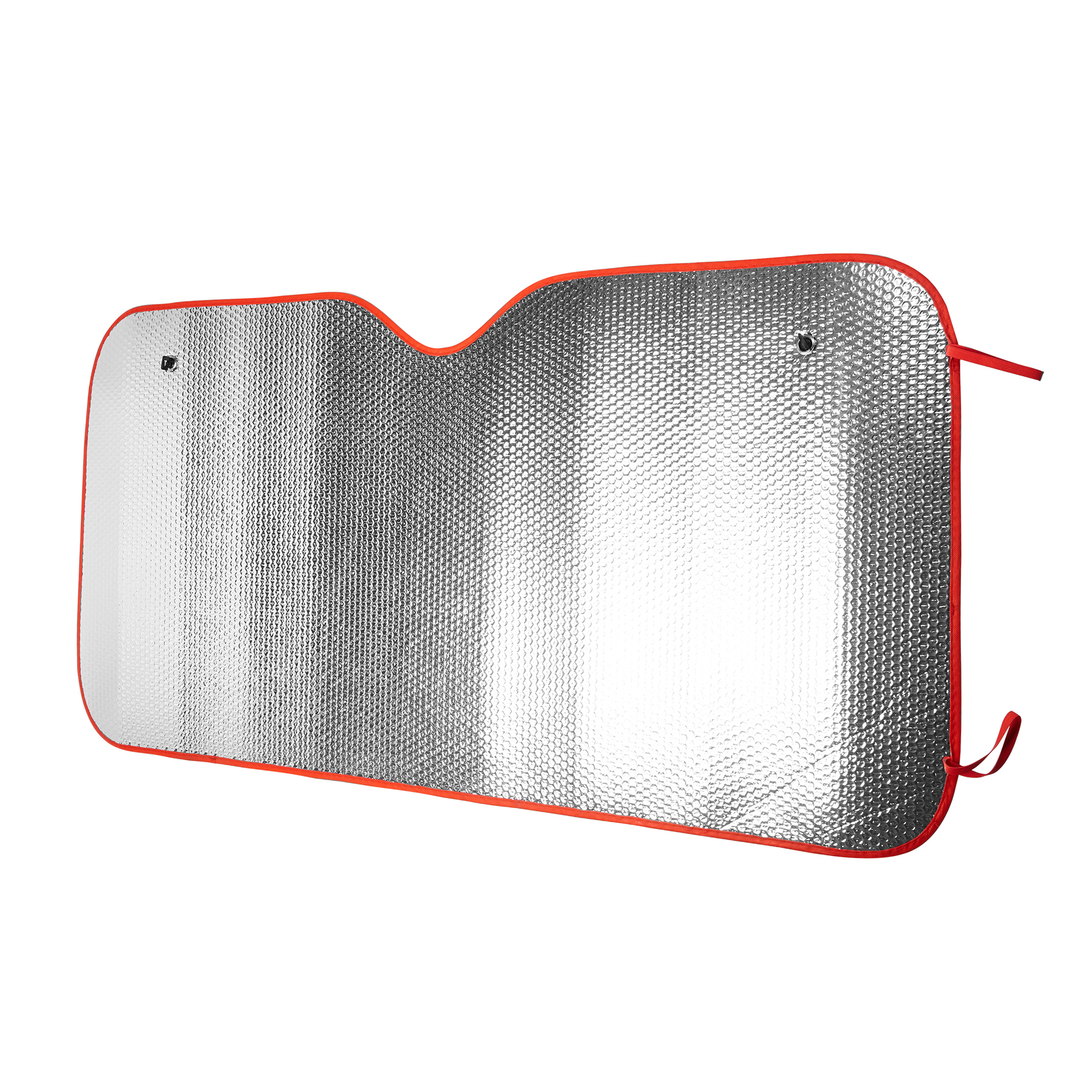 Pare-soleil de voiture avec bulles double face en aluminium. Deux trous dans les deux coins supérieurs pour l’introduction de ventouses pour la fixation à la vitre du véhicule. Garniture et bandes élastiques pour rouler en couleur.