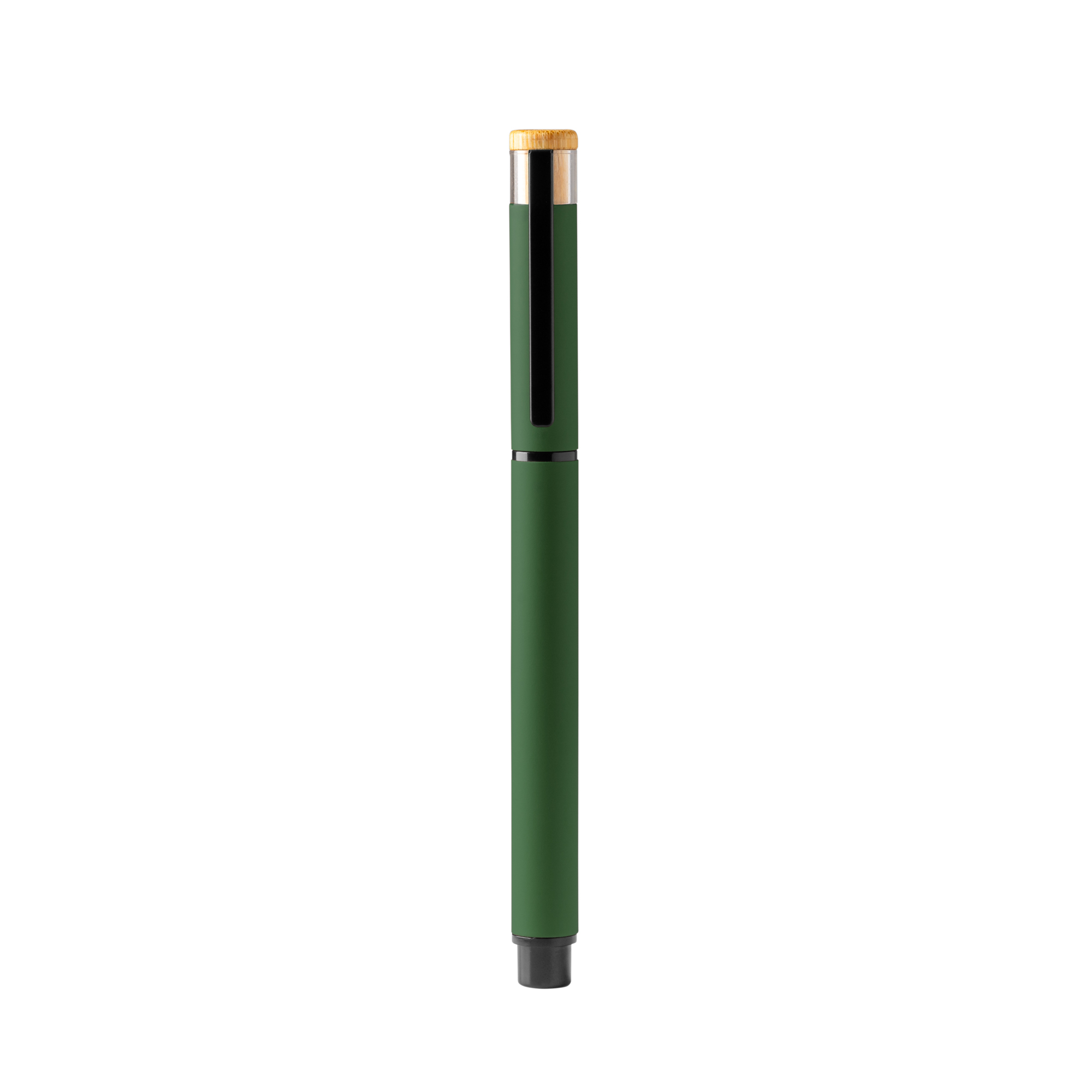 Stylo à bille avec corps en aluminium recyclé, clip en métal et détail en bambou. Recharge d’encre jumbo en bleu.