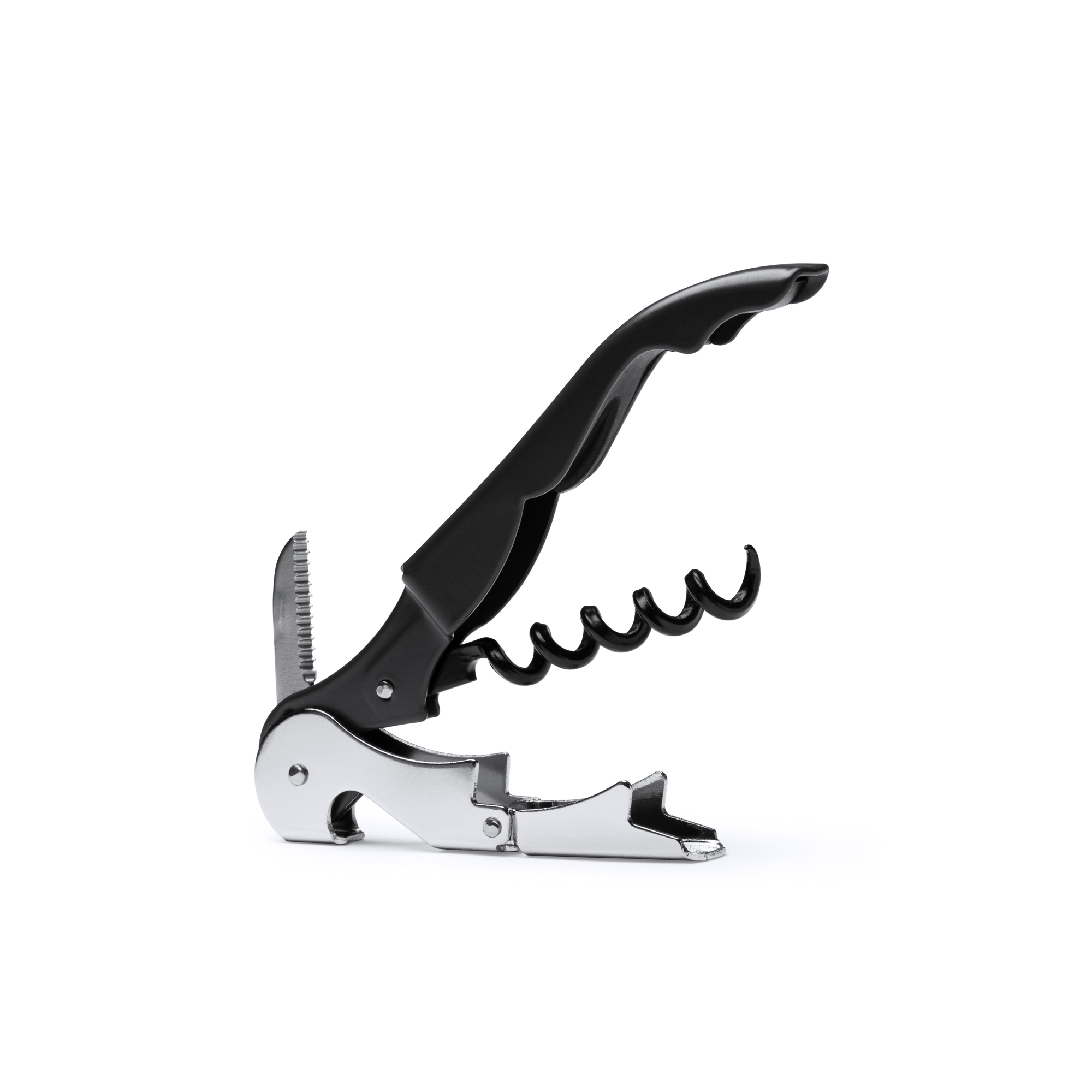 Tire-bouchon classique en acier inoxidable avec deux positions. Présentation boîte blanche.