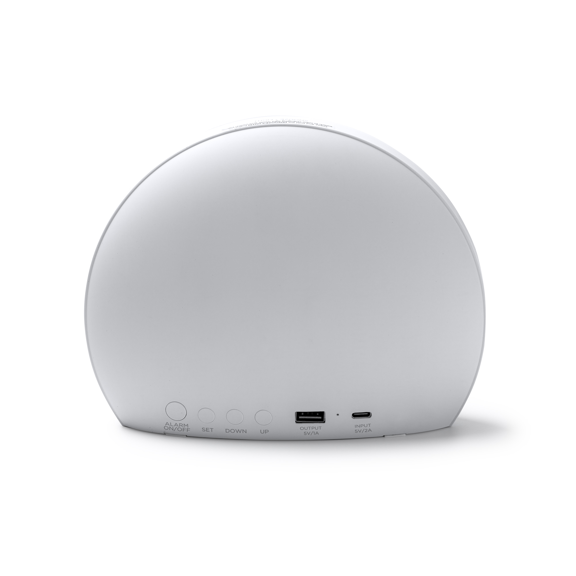 Réveil lumineux en ABS recyclé avec mode lumineux progressif. Caractéristiques : heure, date et température. Lumière LED en plusieurs couleurs. Câble fourni. Présentation en boîte écodesign.