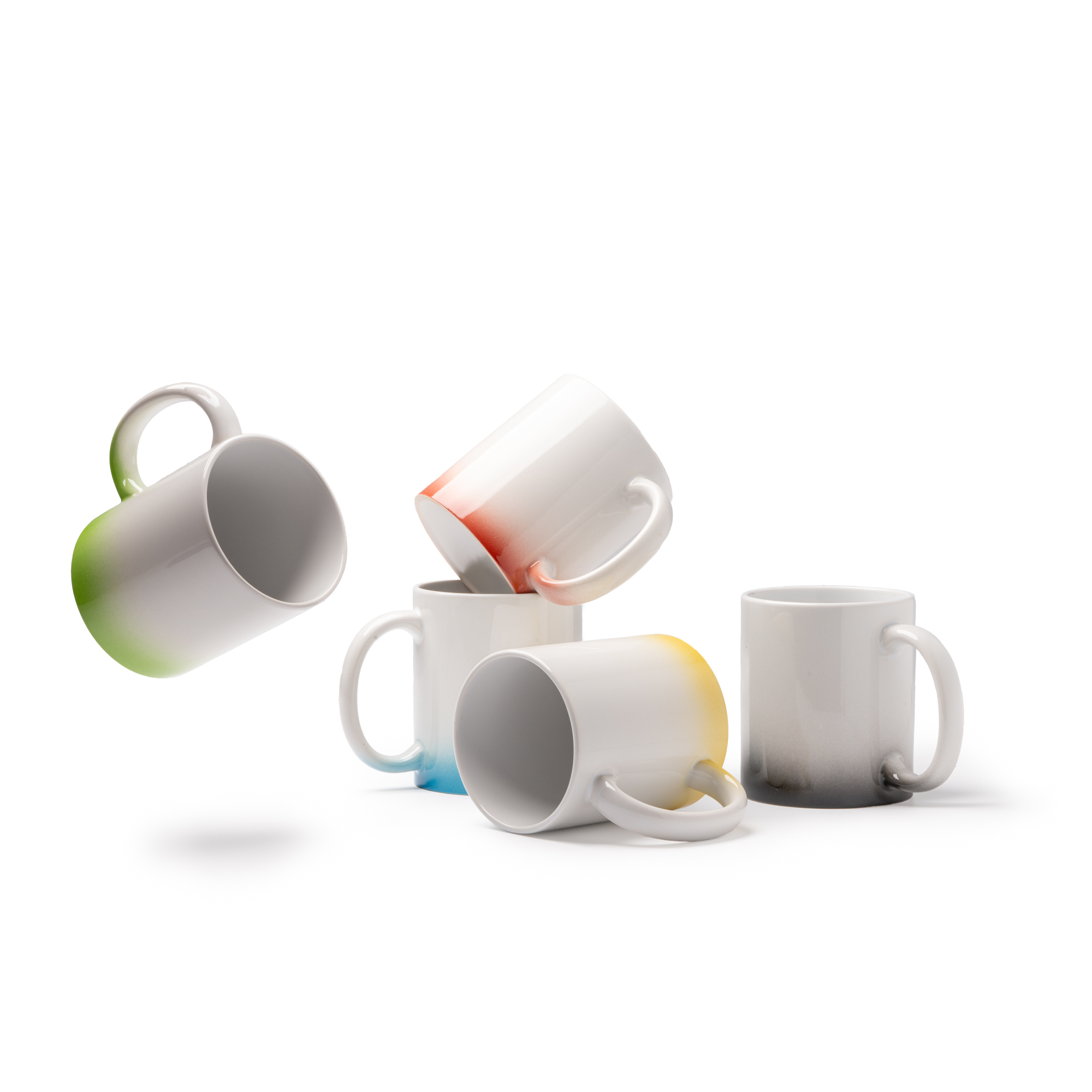 Tasse en céramique spéciale pour la sublimation. Capacité : 350 ml. Base colorée. Présentation en boîte blanche.