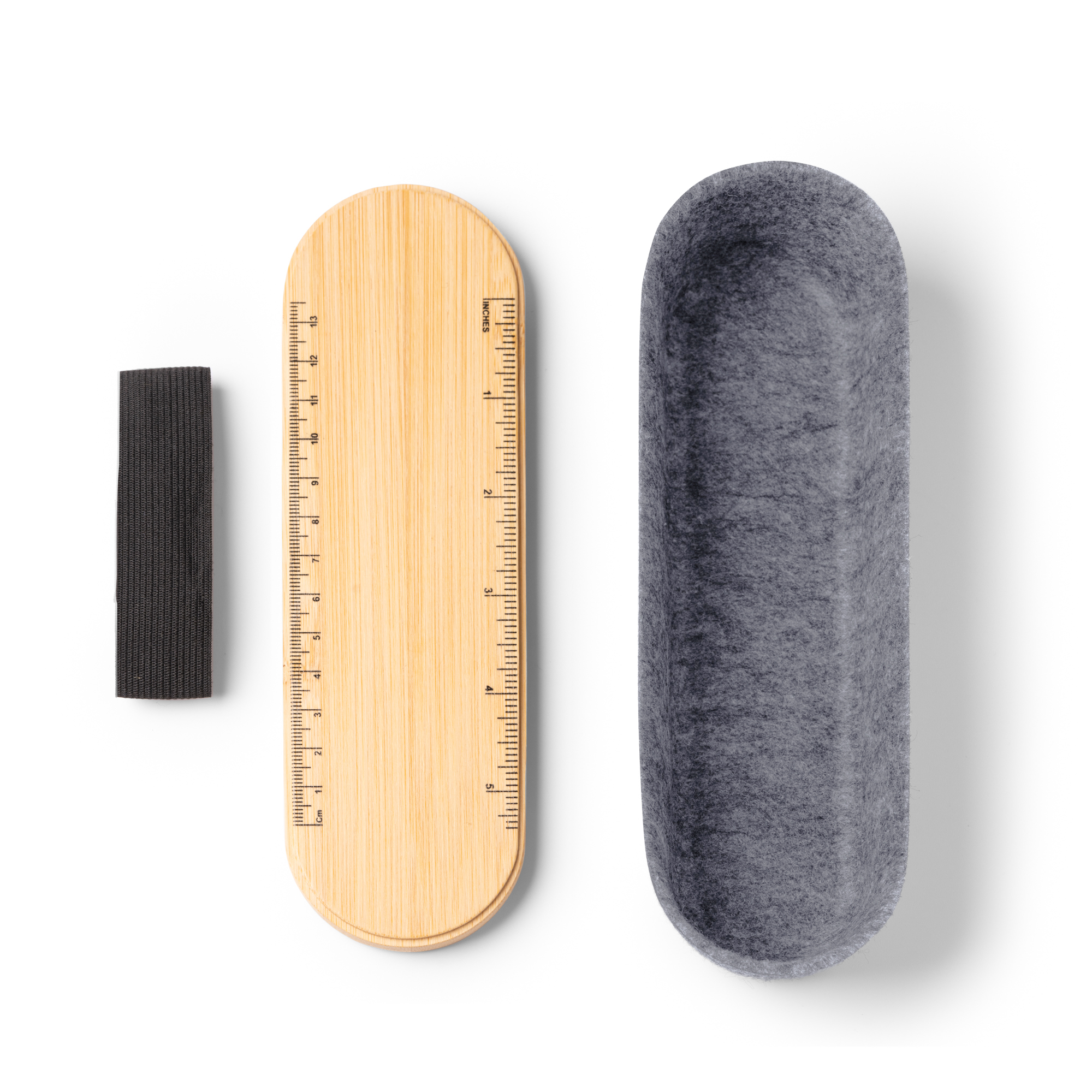 Porte-crayon avec couvercle en bambou et structure principale en feutre recyclage. Règle intégrée sur le couvercle et support pour smartphone.