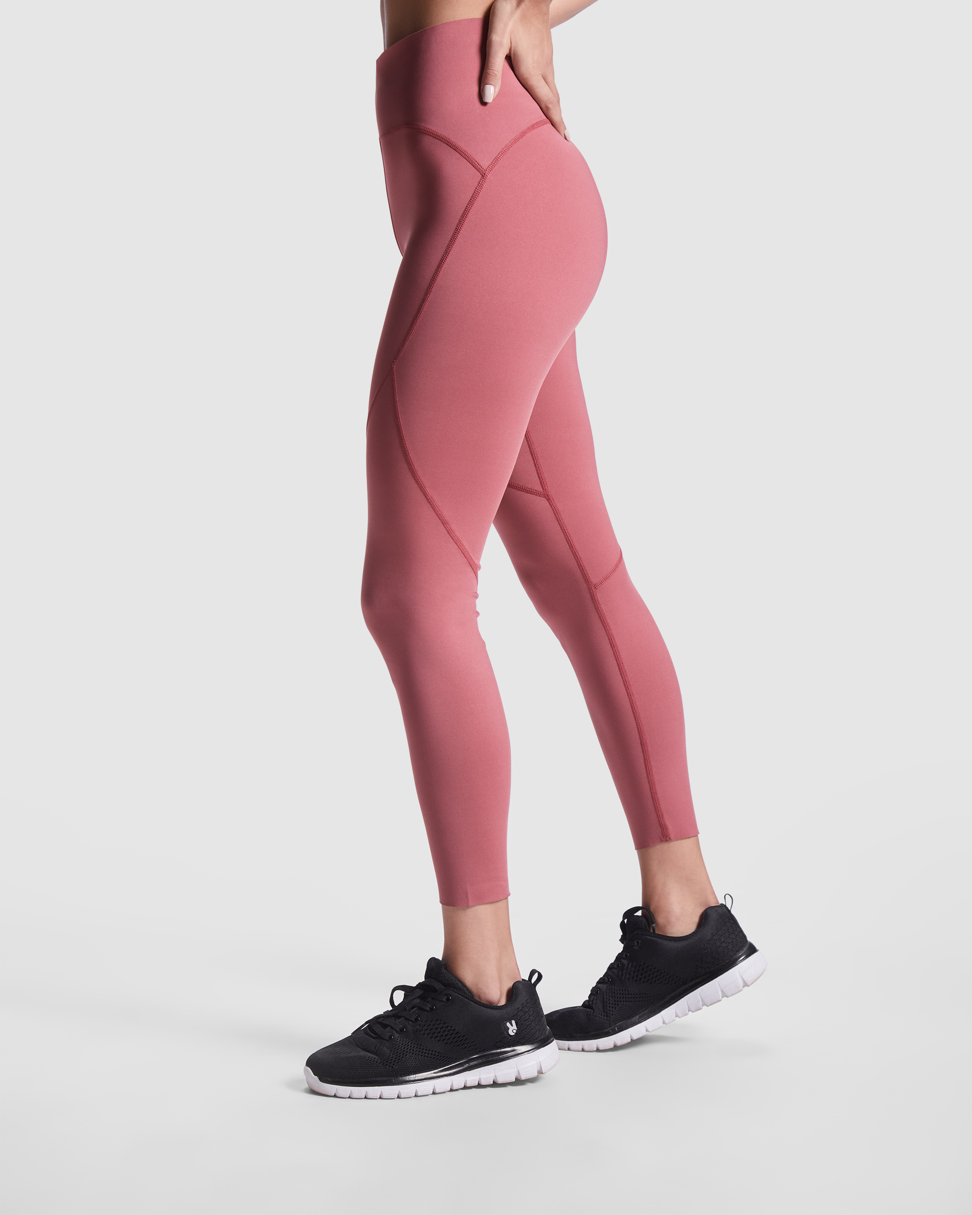 Legging de compression long recyclé. Ceinture large en silicone. Découpe au laser à la taille. Coutures plates pour une résistance au frottement. Certifié GRS.
