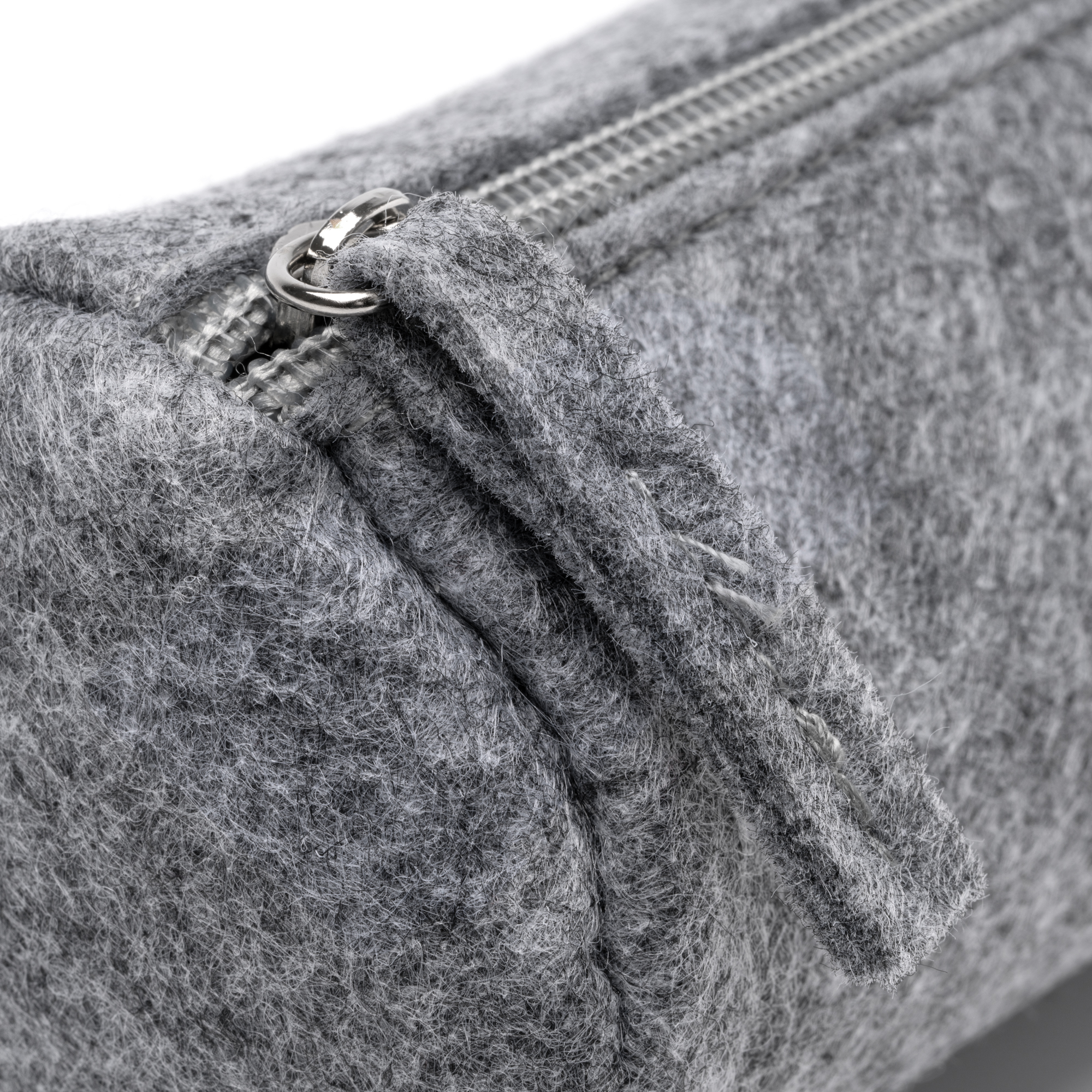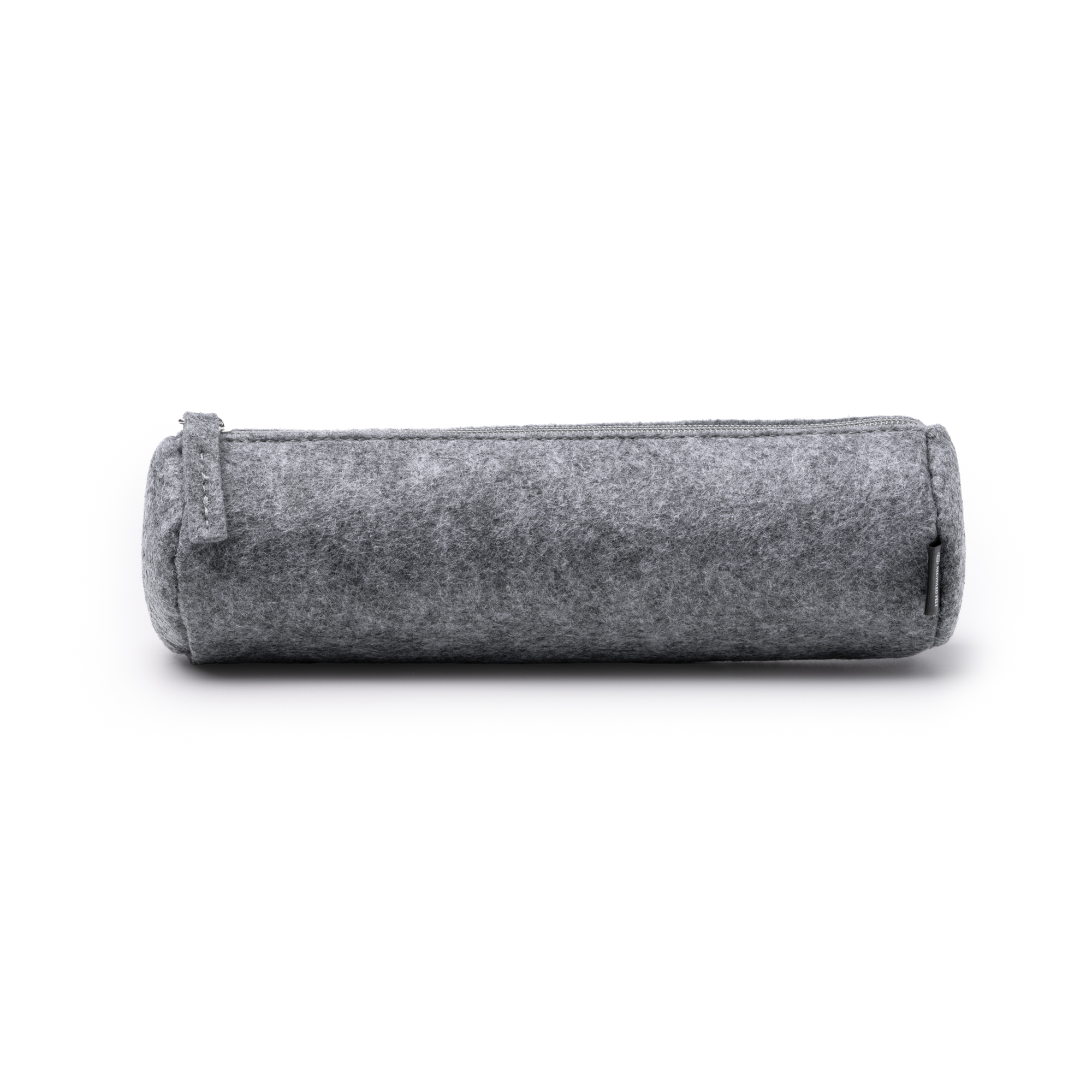 Trousse cylindrique en feutre recyclé avec fermeture à glissière et tirette à glissière assortie.