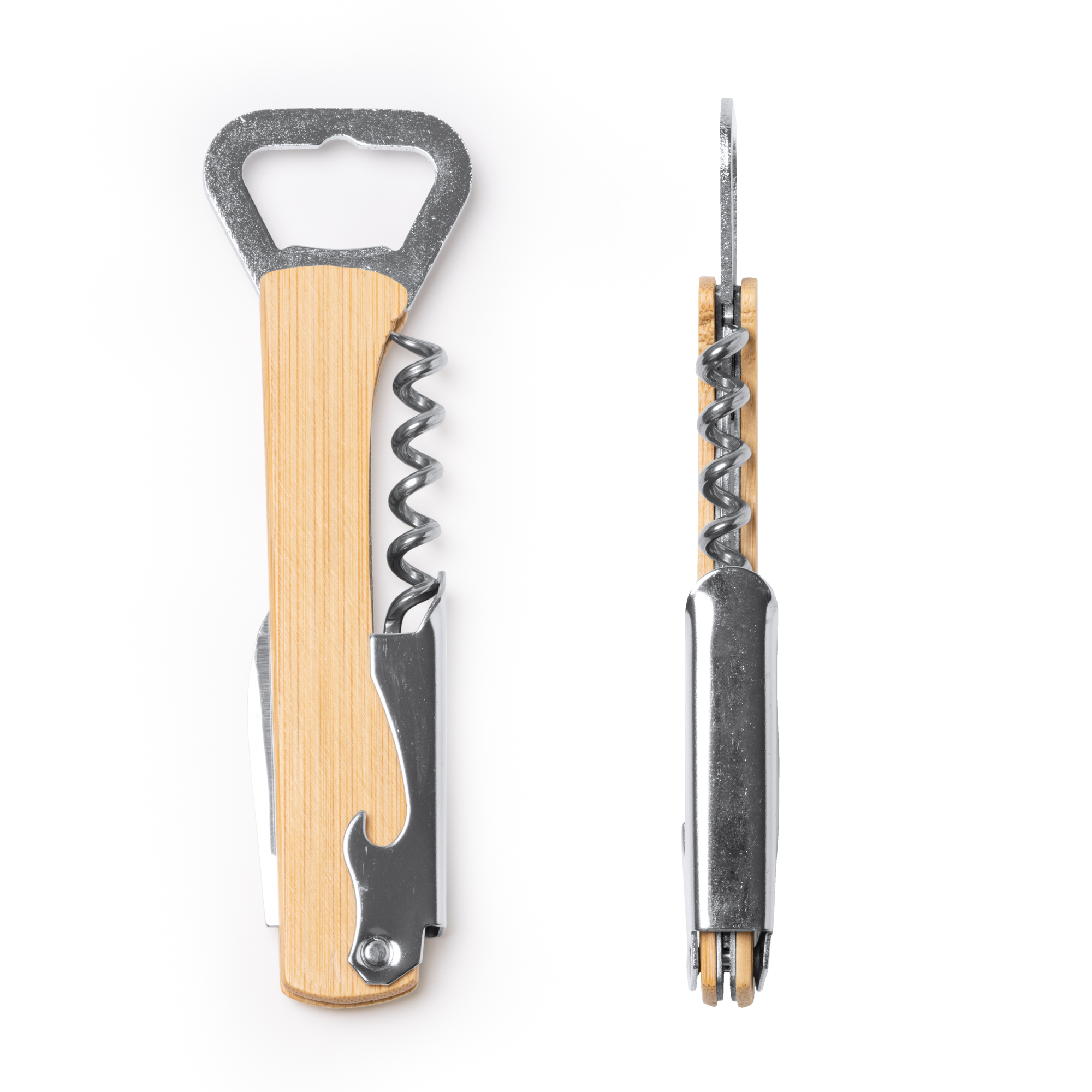Ouvre-bouchon avec tire-bouchon en acier inoxydable dans un design classique avec prise en bambou. Présentation en boîte écodesign.