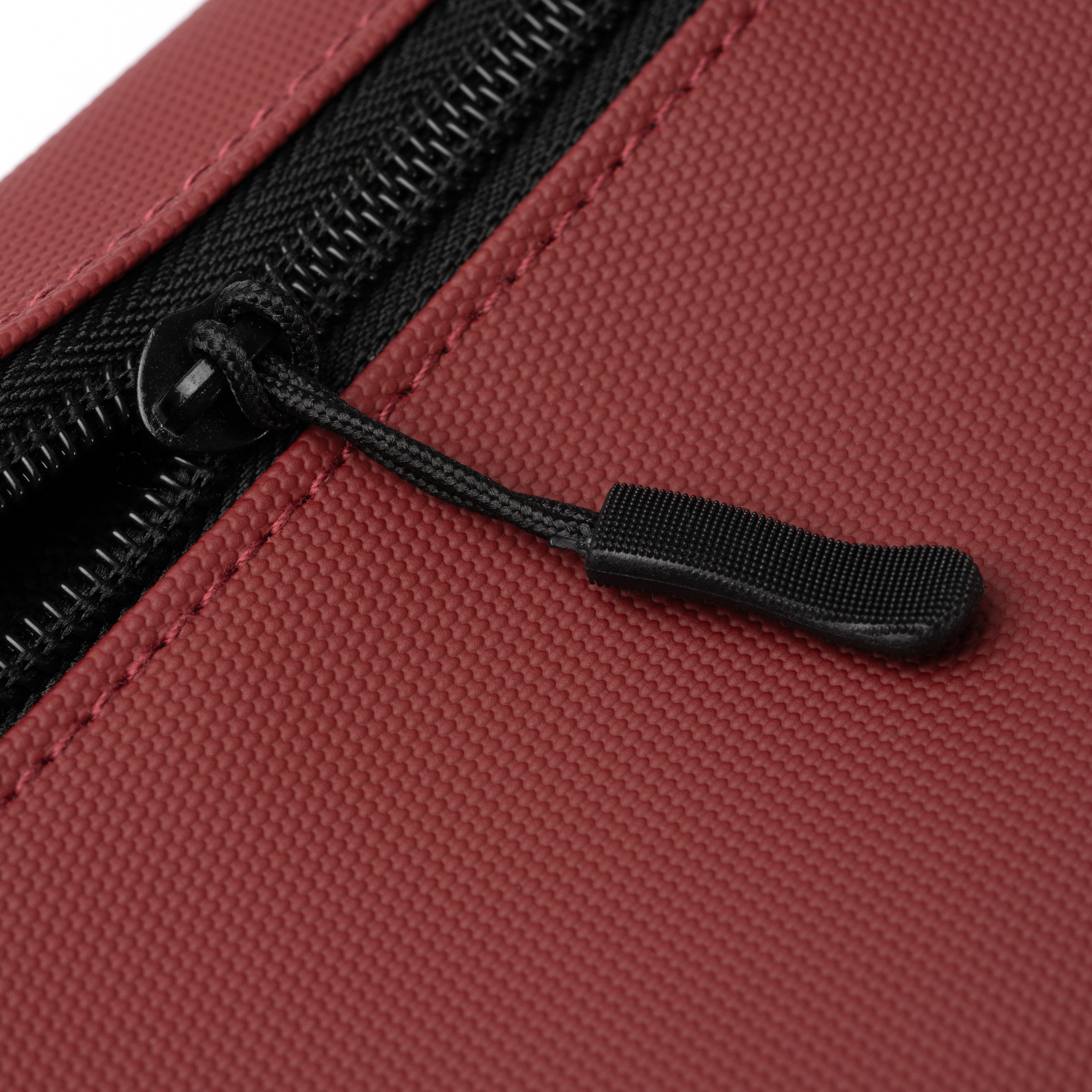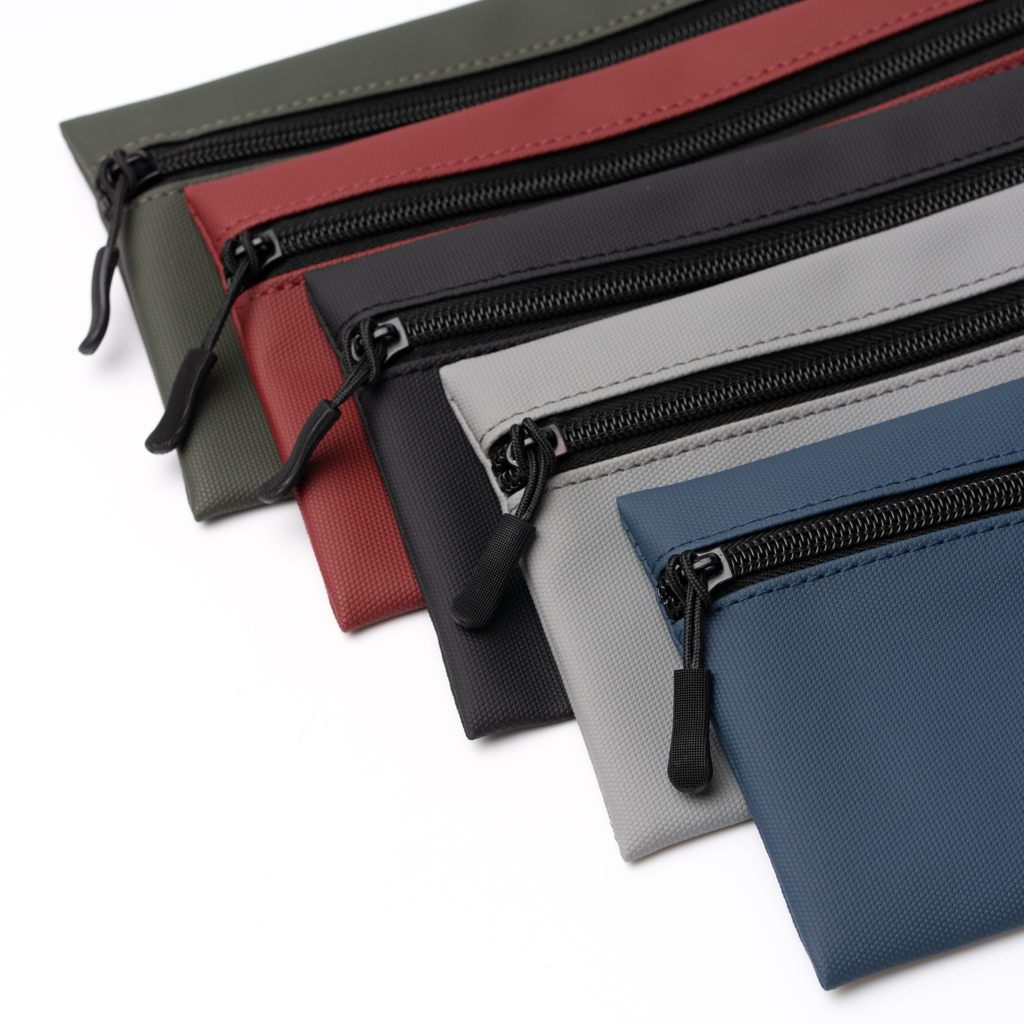 Pochette en PU souple avec une finition de couleur lisse. Comprend une fermeture à glissière et une tirette noire.
