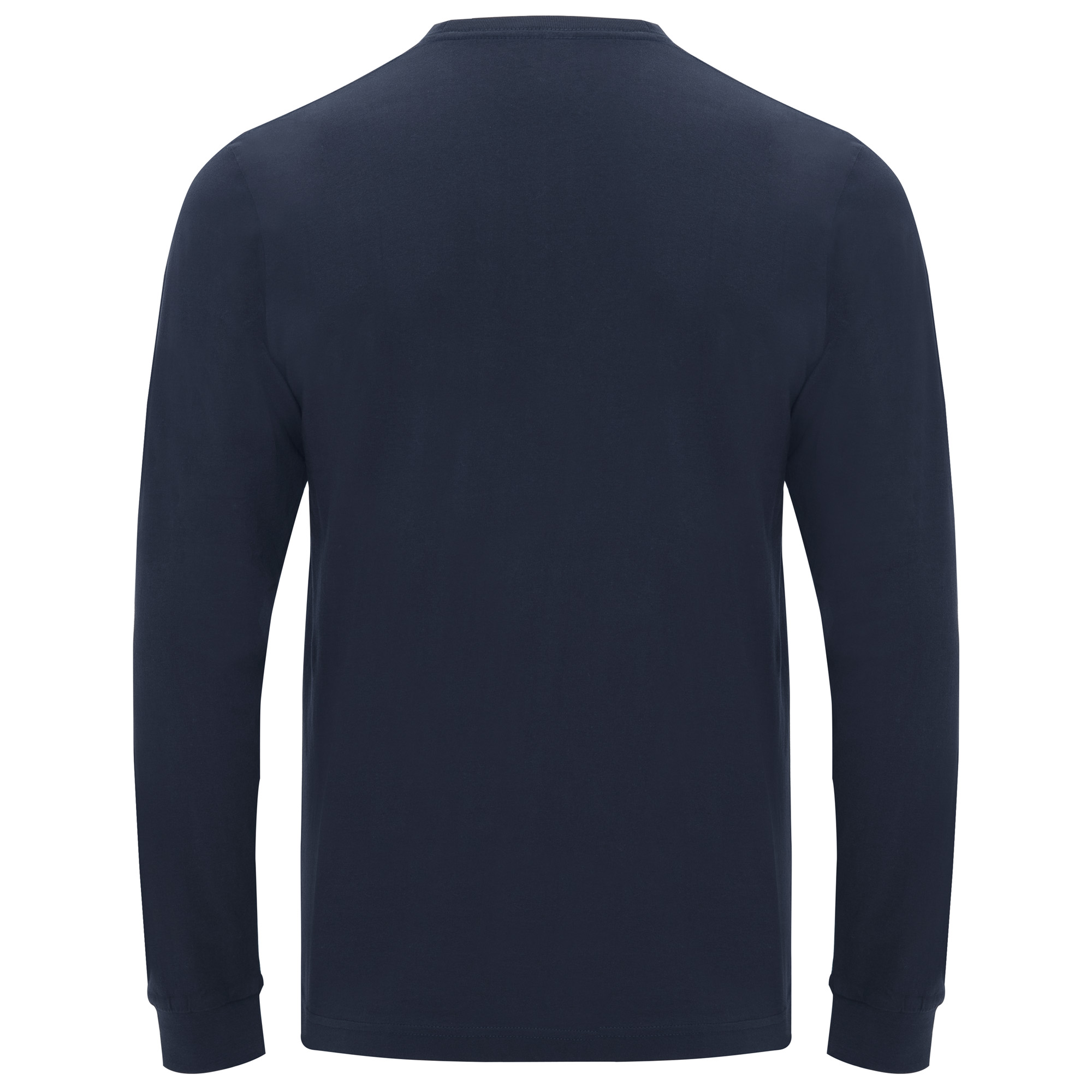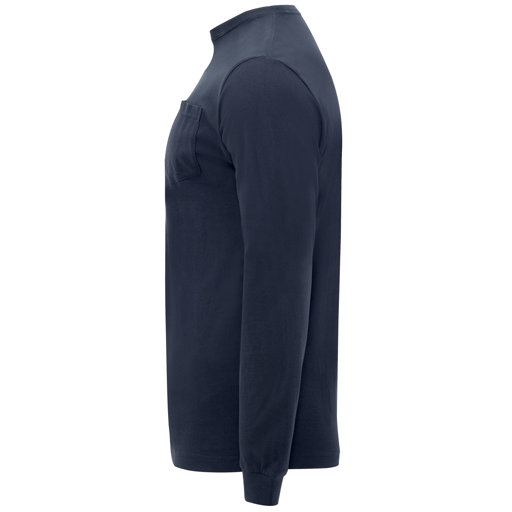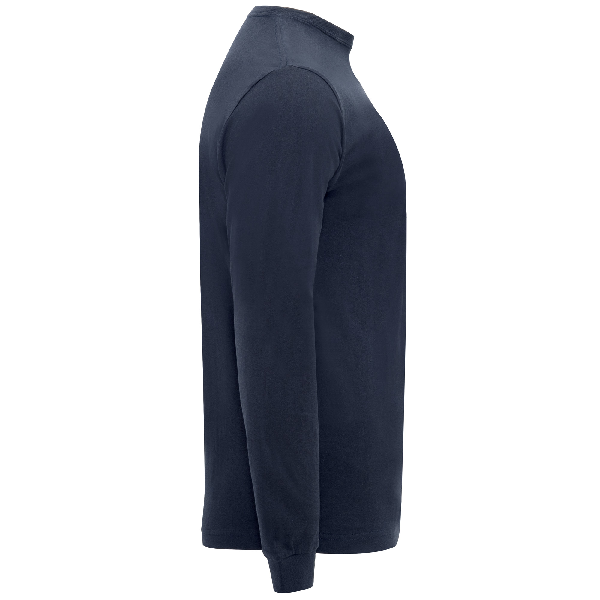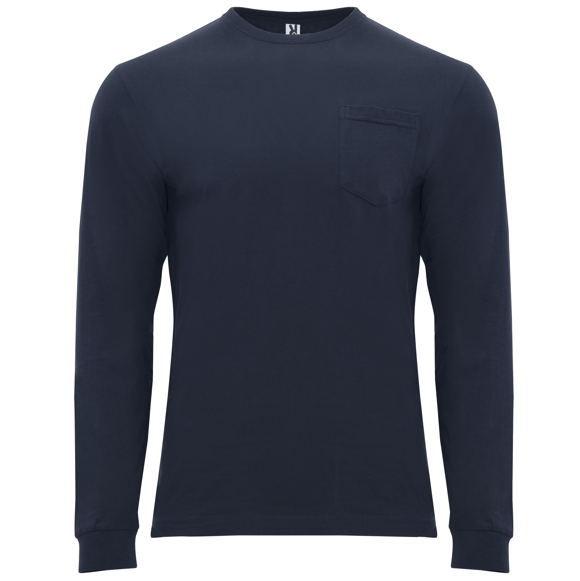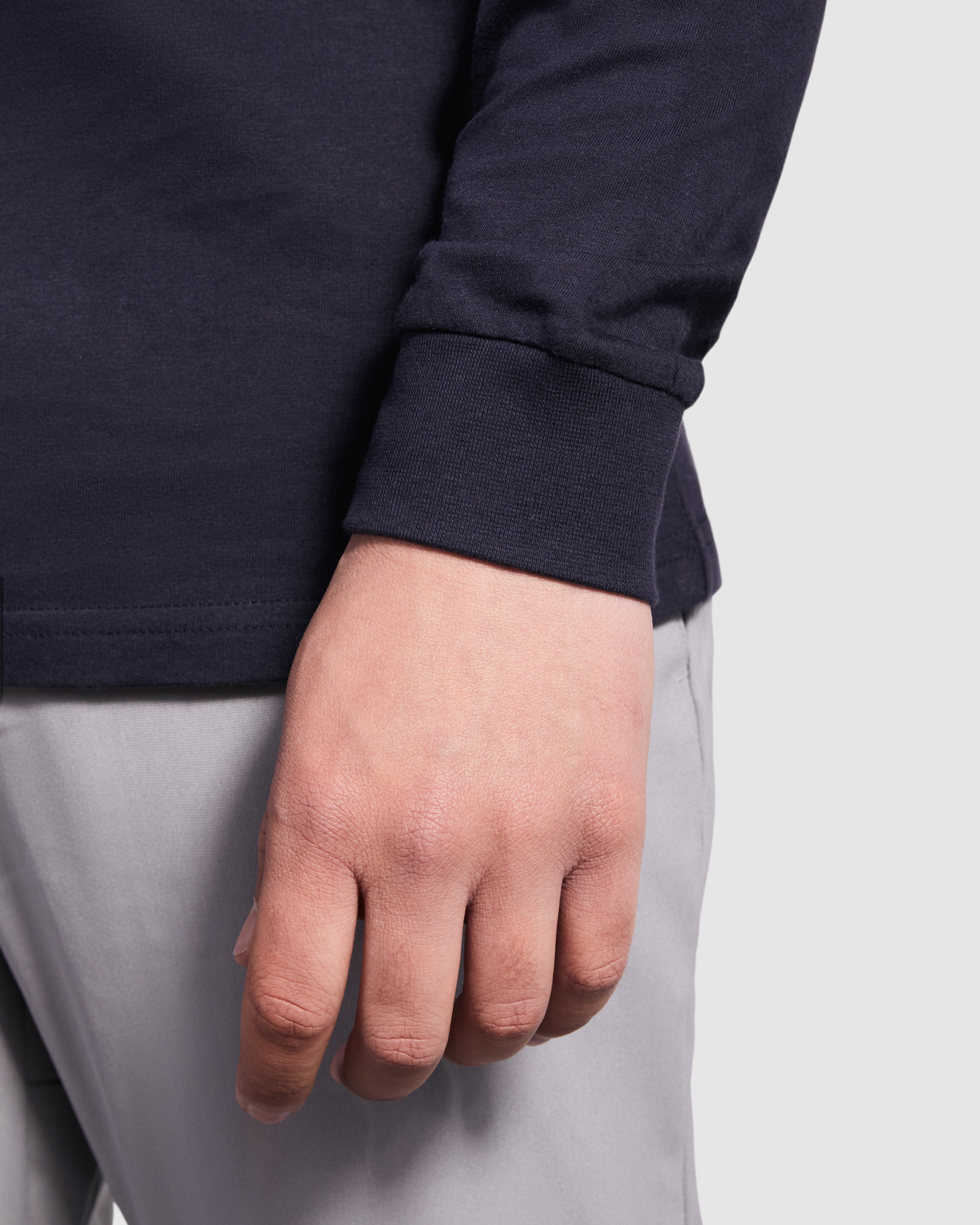 T-shirt à manches longues avec coutures latérales. Col rond côtelé 1×1 et manchettes. Encolure bordée de tissu assorti. Poche poitrine gauche.