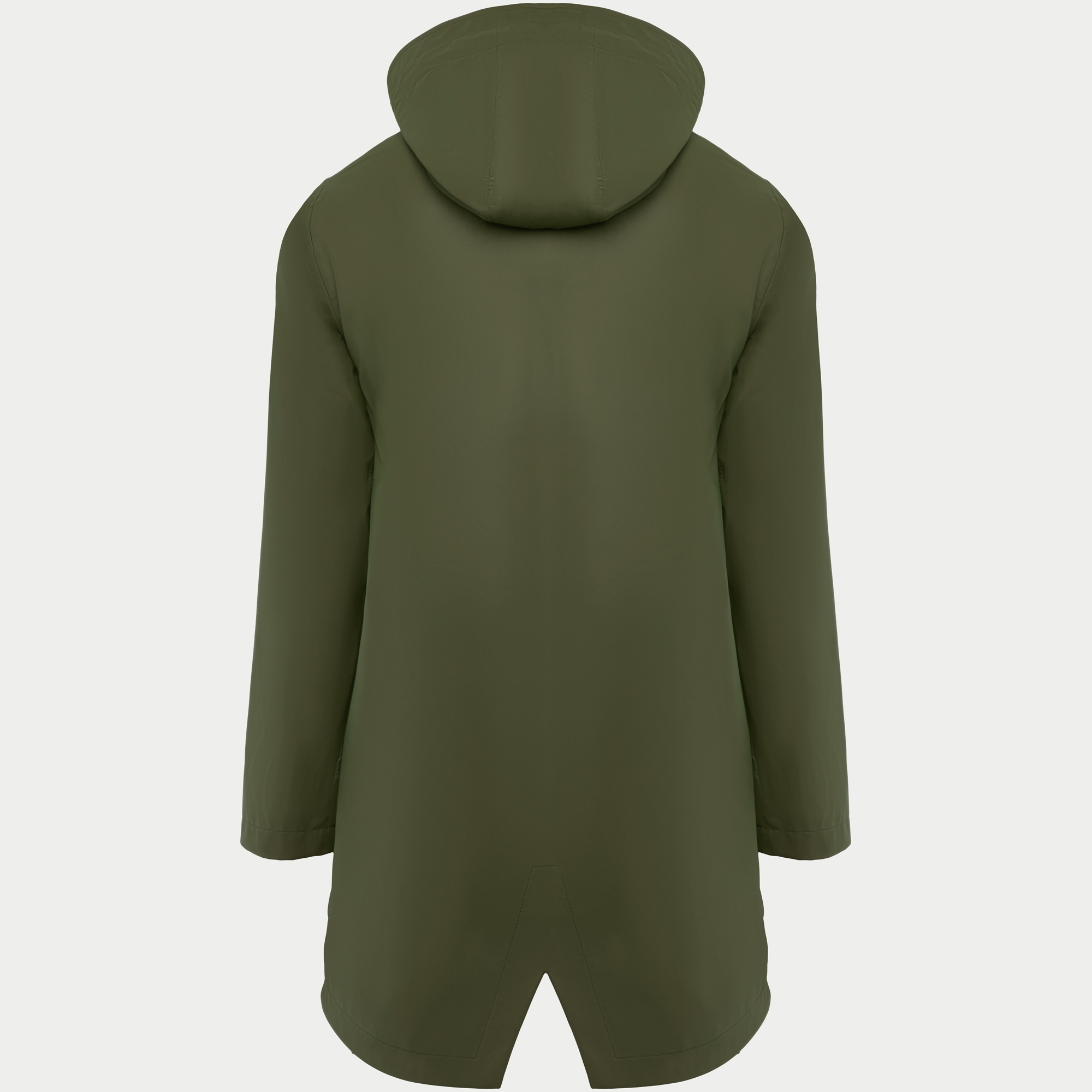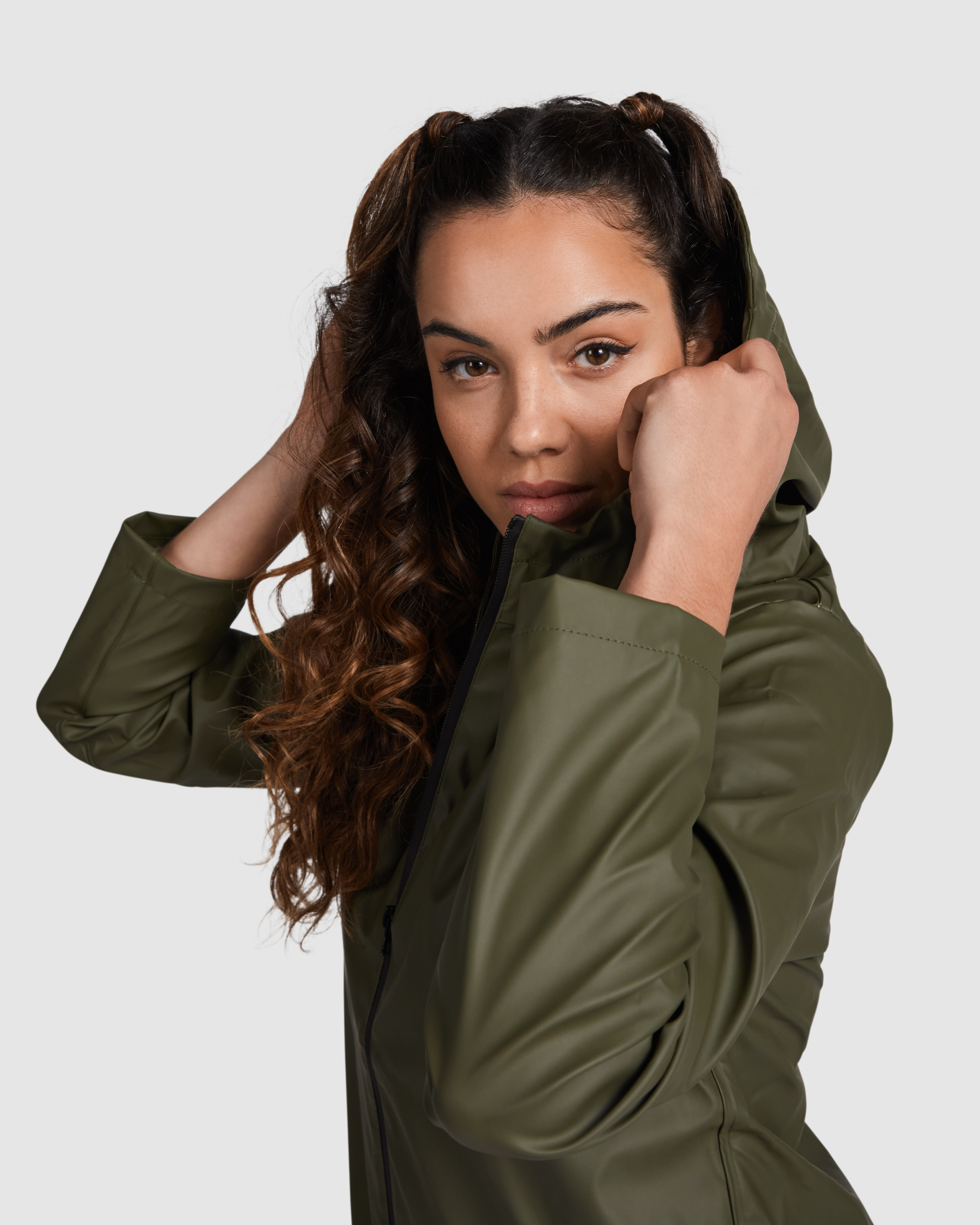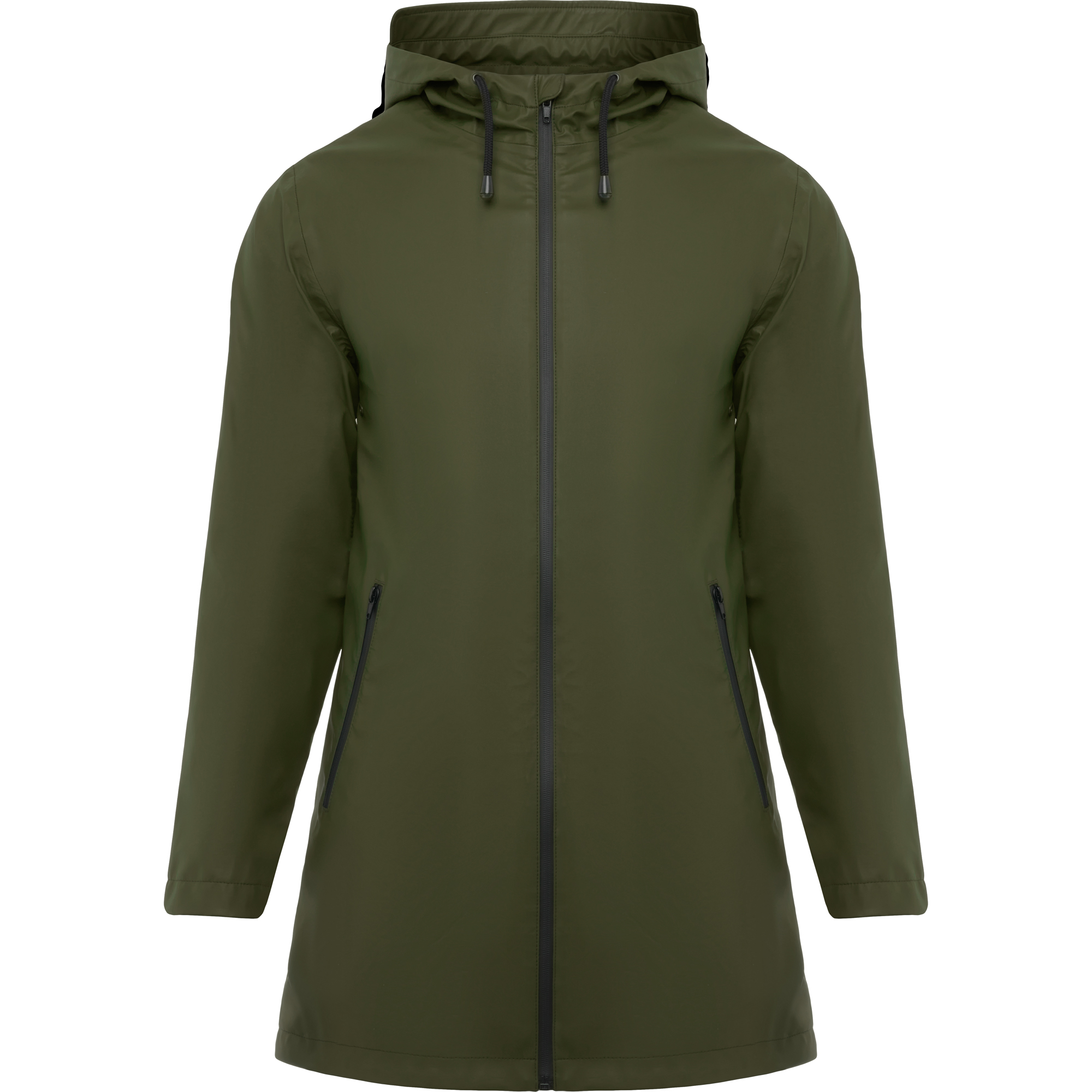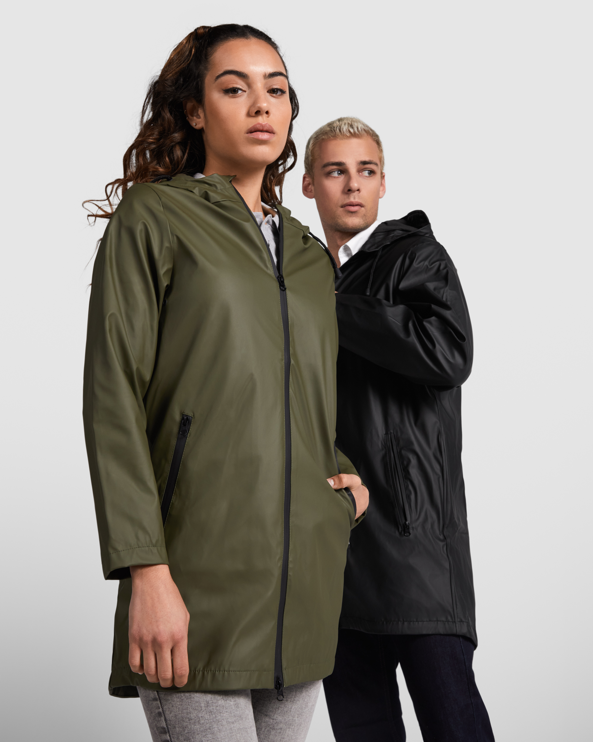Imperméable à capuche fixe et visière légèrement ajustée à la taille. Fermeture à glissière frontale bidirectionnelle, poches latérales et coutures thermosoudées. Cordon de serrage réglable dans la capuche. Ouverture arrière. Accès intérieur pour retraitement.