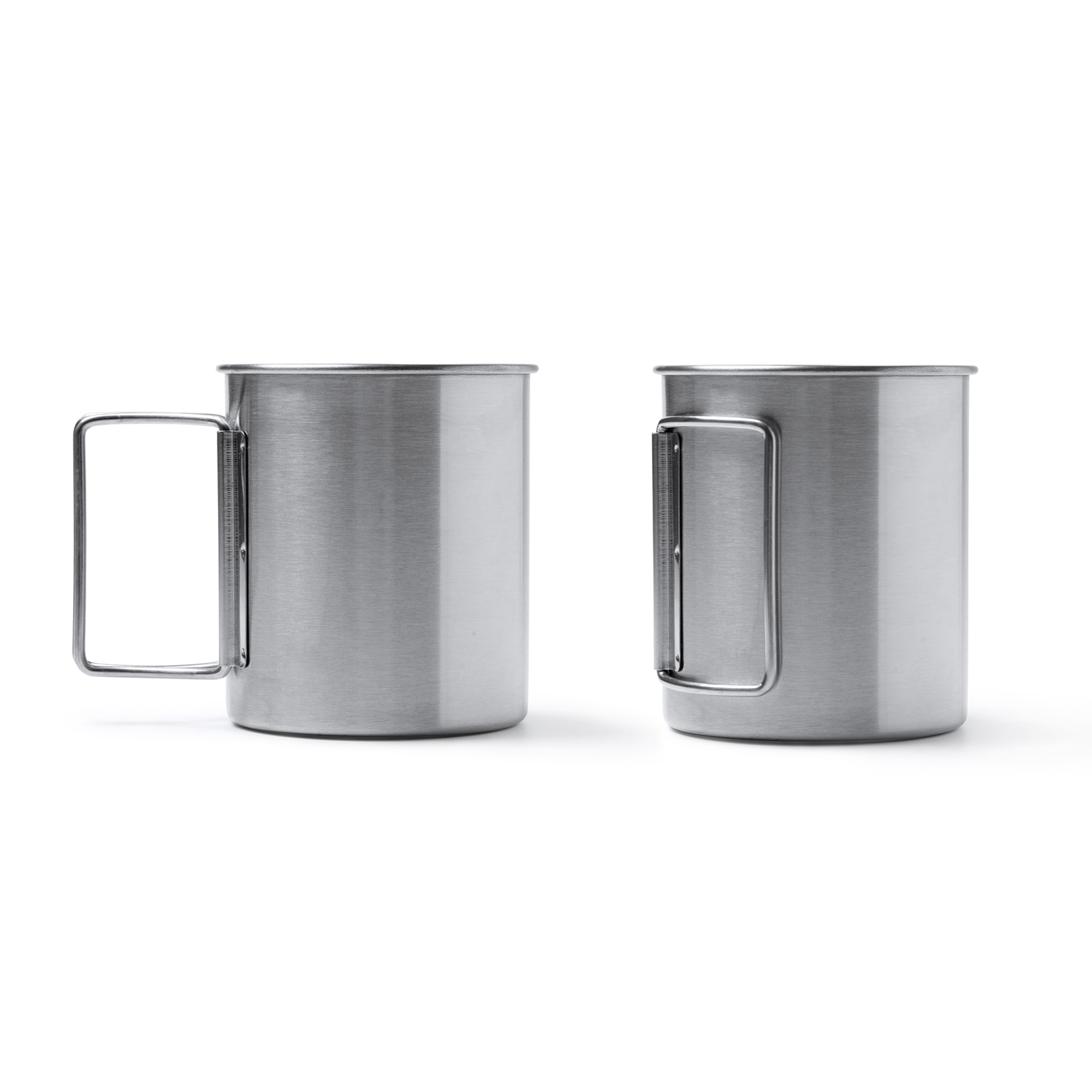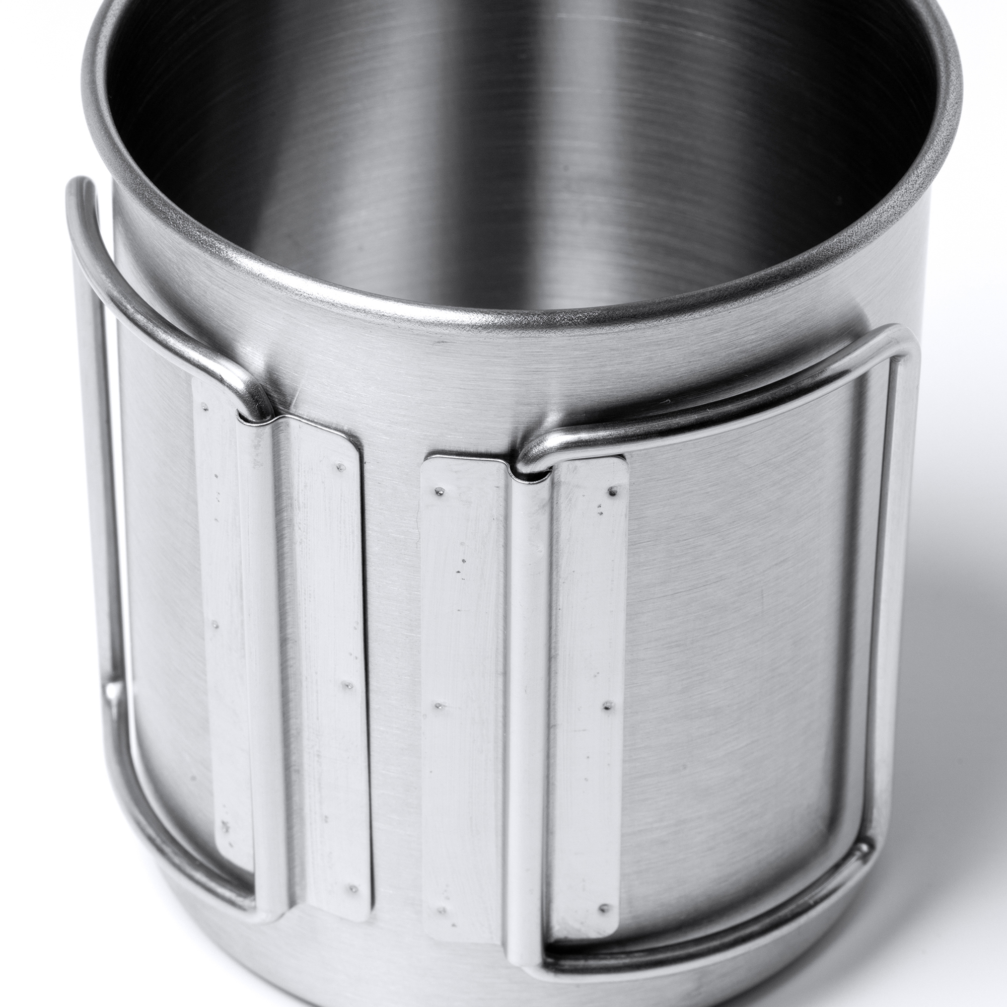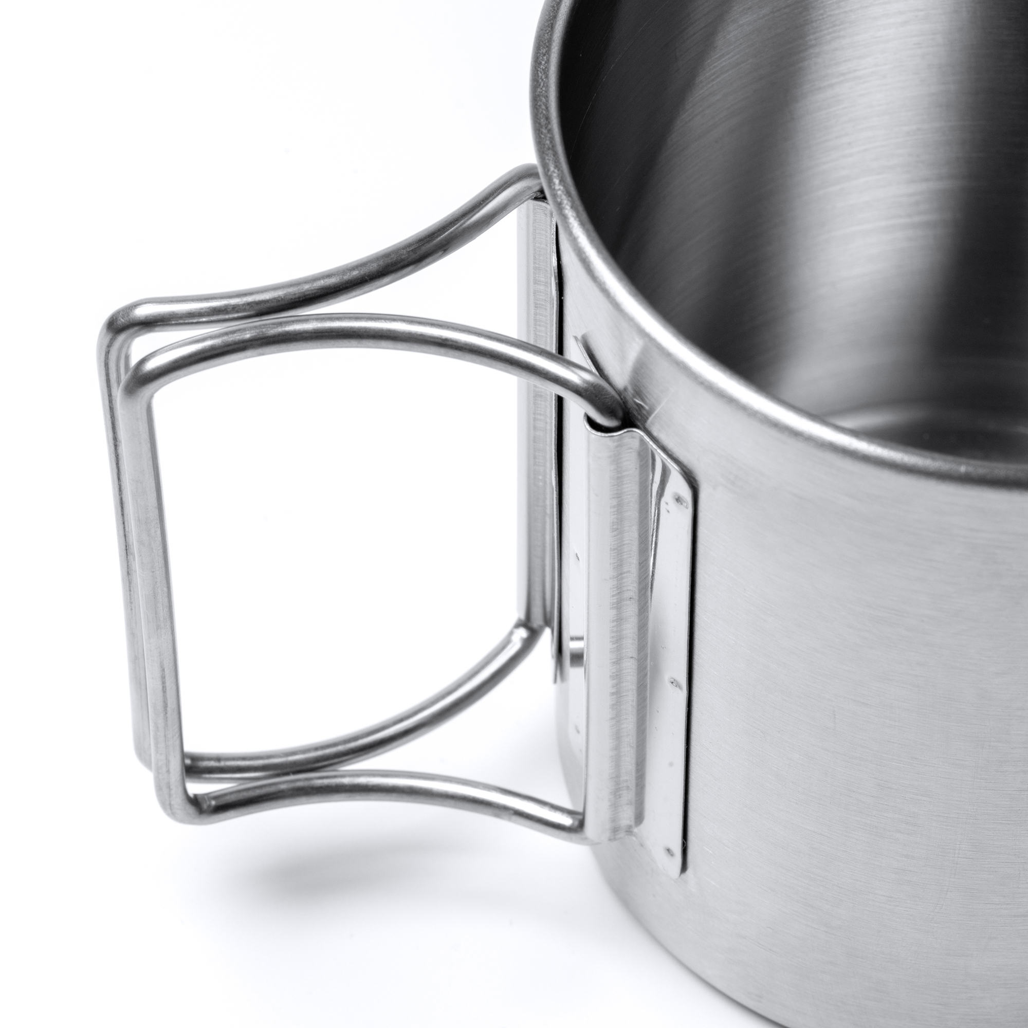 Tasse en acier inoxydable 304 avec poignées pliantes. Capacité 450 ml. Mug idéal pour le camping ou l’aventure.
