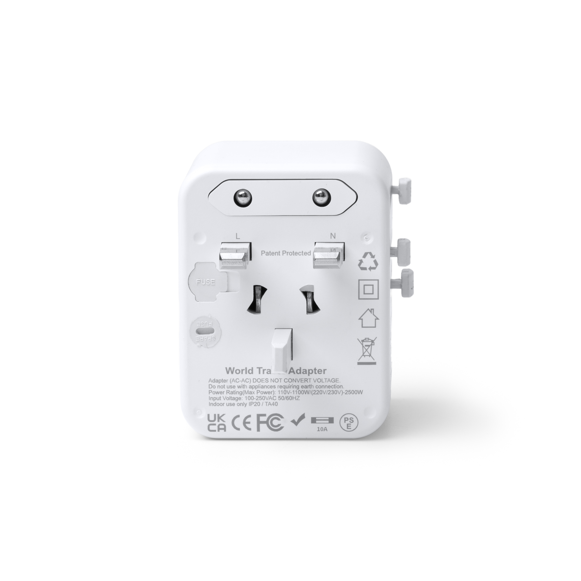 Adaptateur de prise de voyage. Fabriqué en polycarbonate de haute qualité avec une puissance de 20 W et une charge rapide. Comprend deux sorties USB et deux sorties type USB-C. Valable pour l’Europe, le Royaume-Uni, les États-Unis, l’Asie et l’Australie.