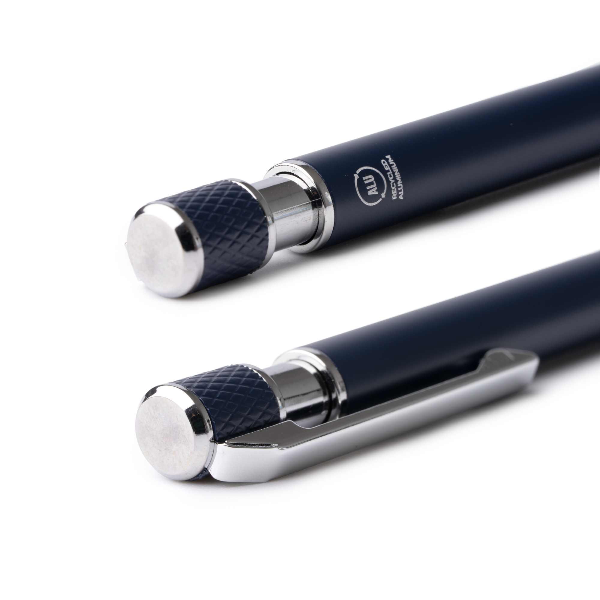 Stylo en aluminium recyclé, finition mate unie, avec des détails argentés. Texturé dans la zone de prise en main et sur le bouton. Encre bleue.