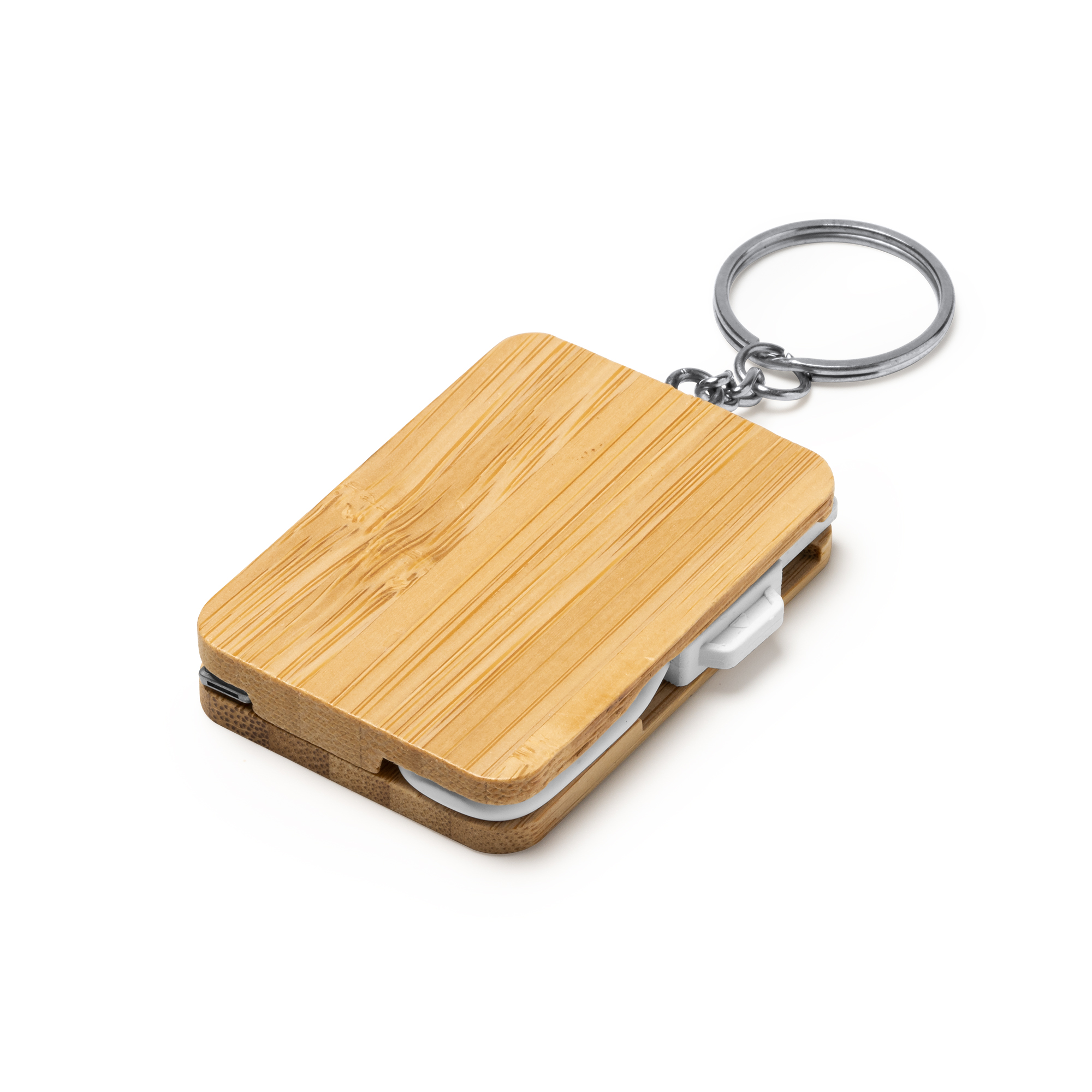 Porte-clés avec câble de charge 3 en 1. Structure principale en bambou naturel. Connexion Micro USB, Type C et Lightning. Présentation en éco sac avec ouverture.