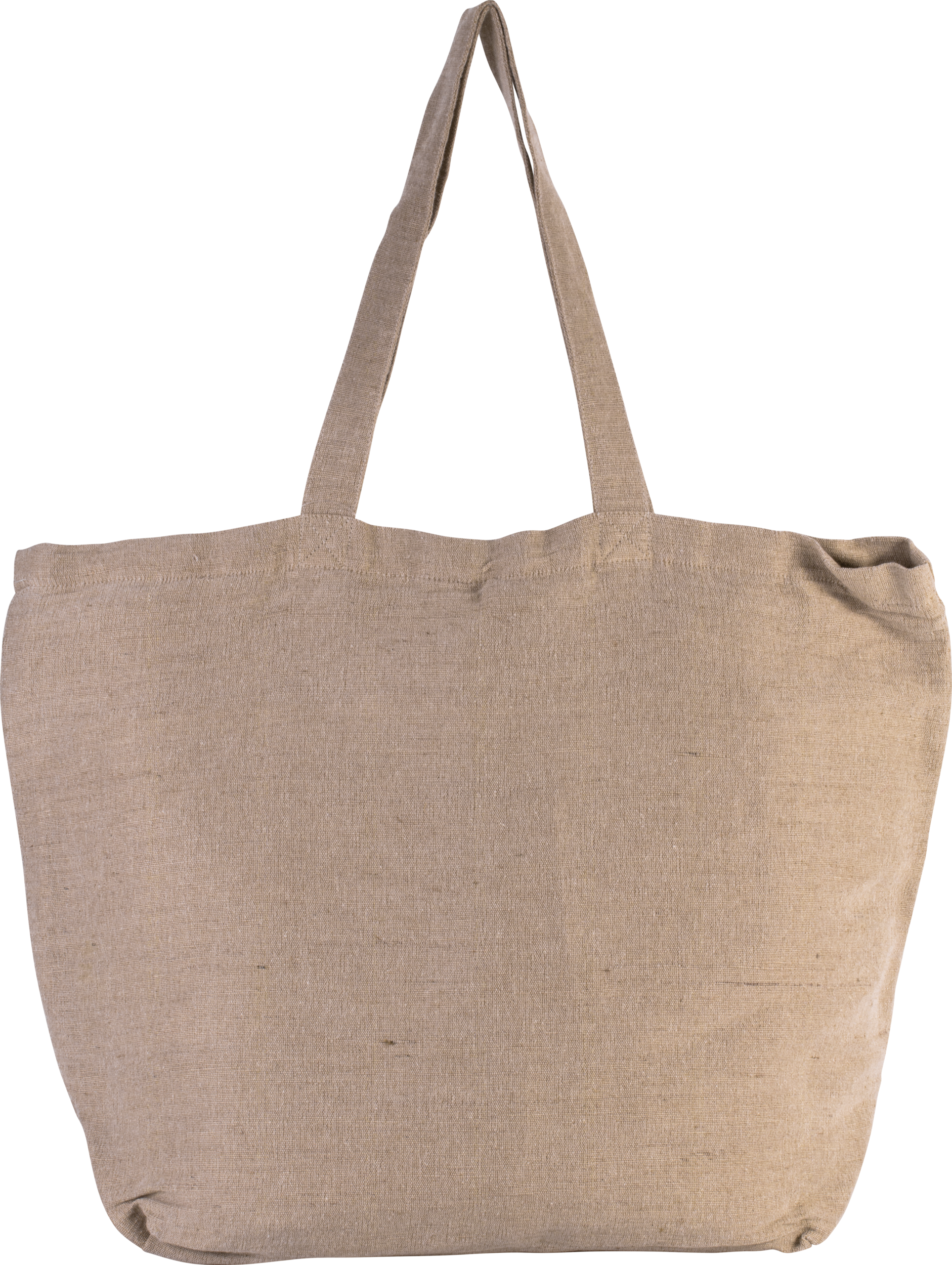 Grand sac fourre-tout en toile de jute et coton (juco). Doublure en coton, poche intérieure zippée, soufflet, anses de 65 cm dans la Même matière et couleur. Fermeture avec bouton pression aimanté.