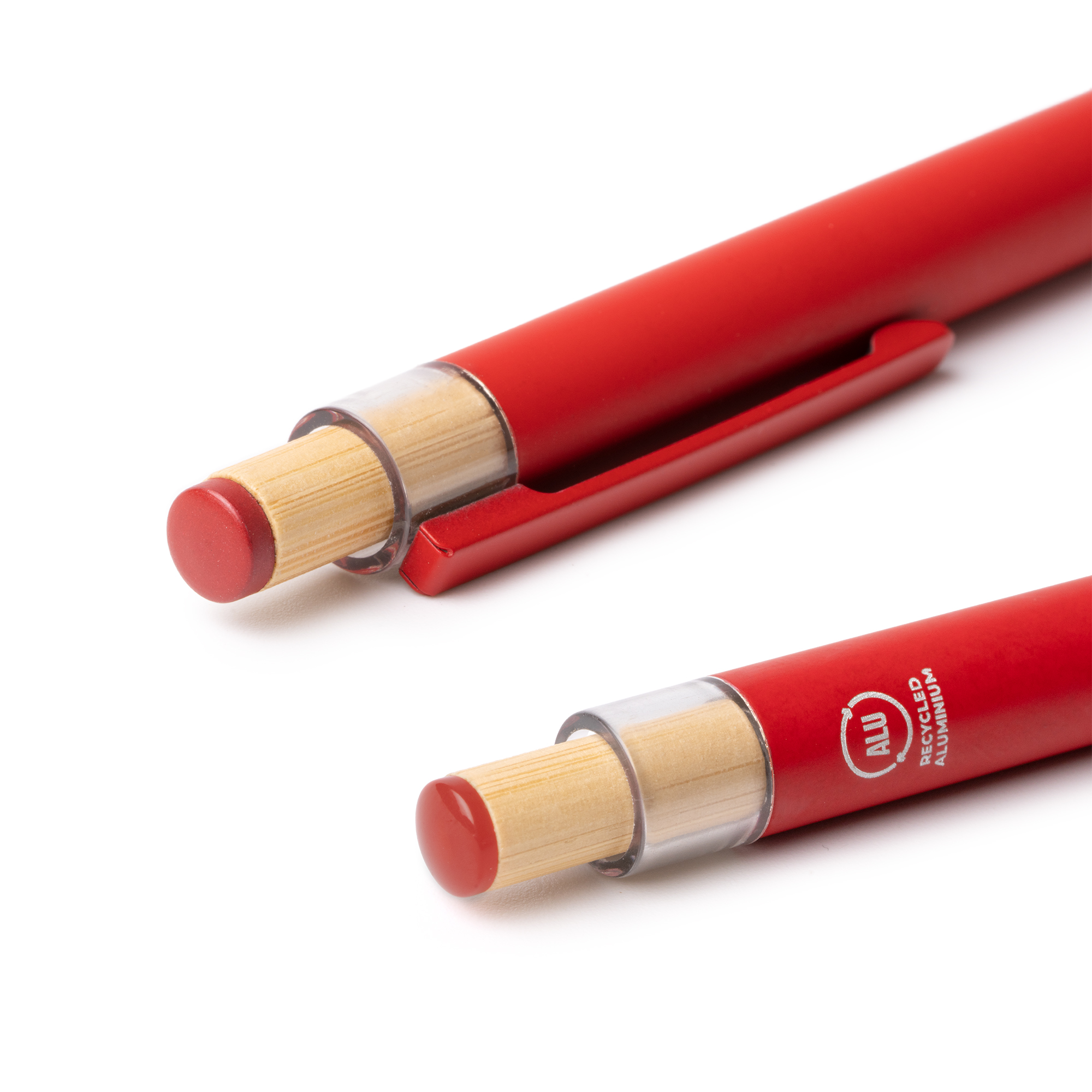Stylo à bille en aluminium recyclé avec un fini mat. Comprend un bouton-poussoir en bambou avec des détails de Couleur, ainsi qu’un pointeur tactile et un clip assortis. Recharge d’encre bleue Jumbo.