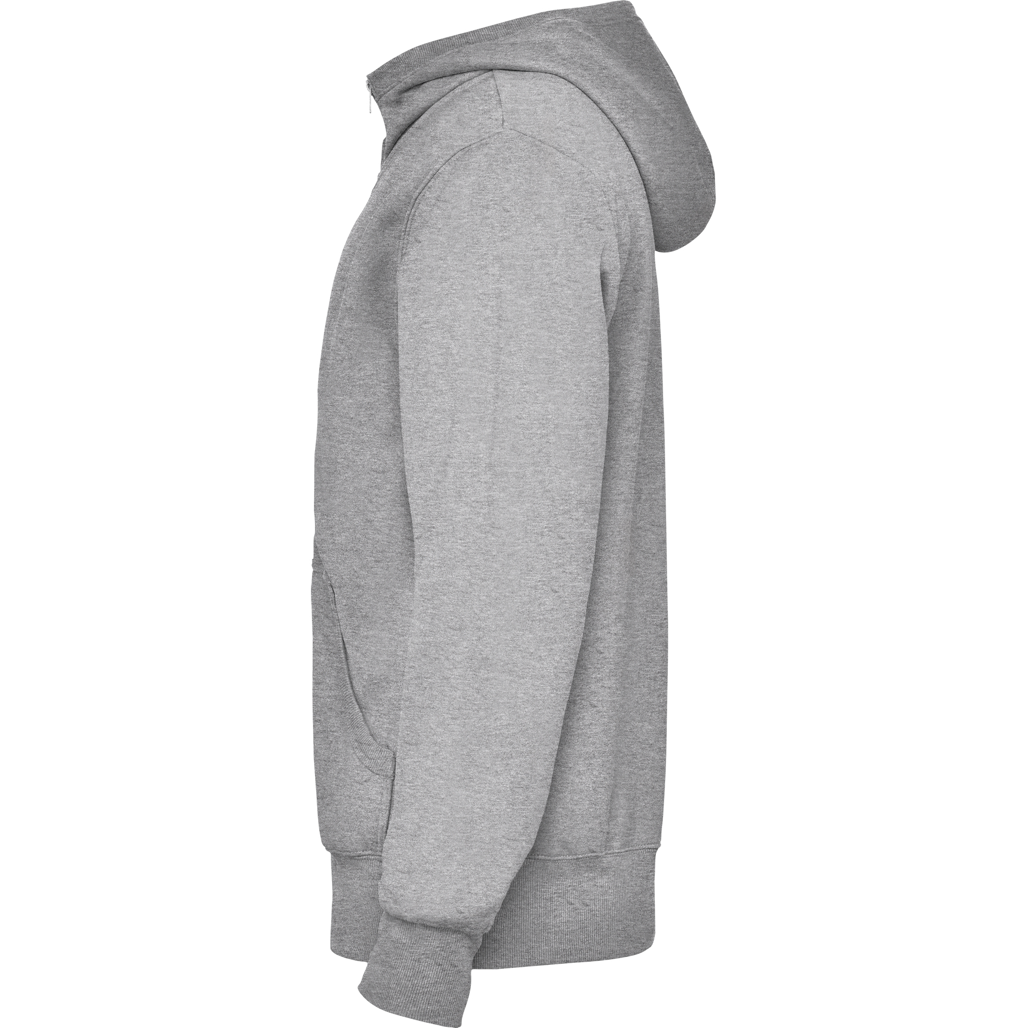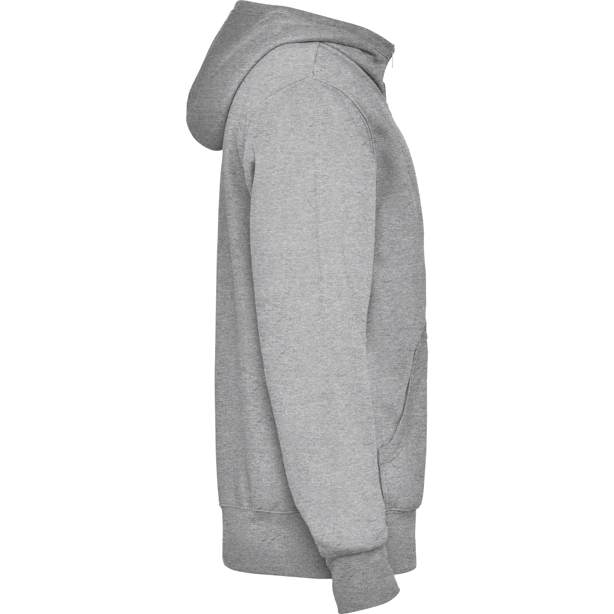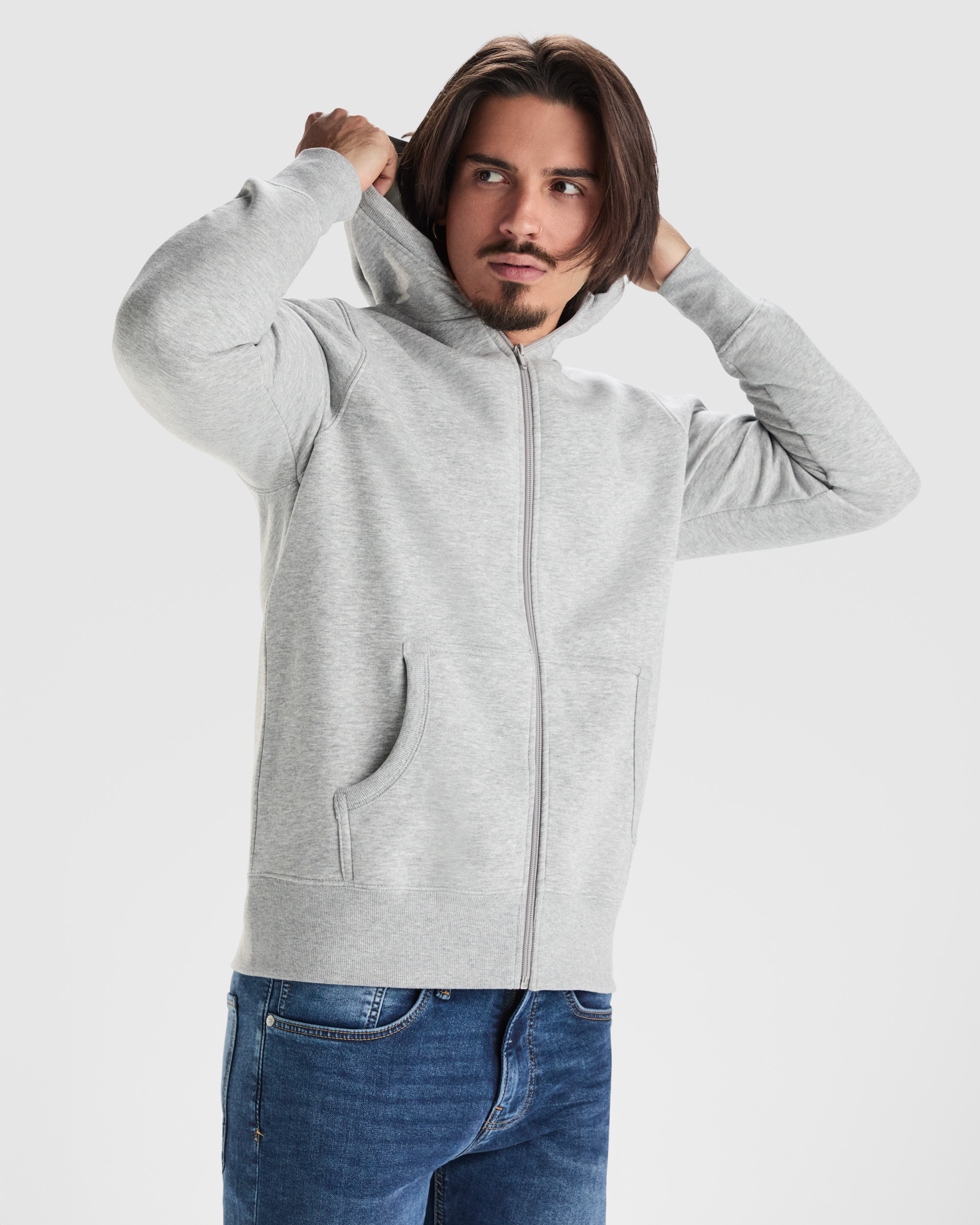 Sweatshirt unisexe avec fermeture zippée sur le devant et capuche. Fermeture à glissière assortie. Poches kangourou, capuche, poignets et taille côtelés 2×1 avec élasthanne. Coutures bordées de tissu assorti.