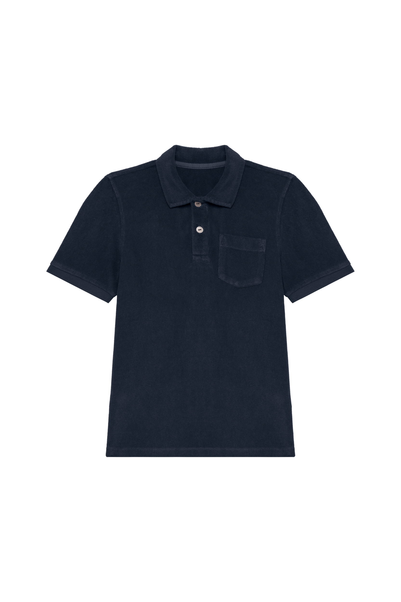 80% coton biologique / 20% polyester recyclé post-consumer. Fabriqué au Portugal. Coton peigné. matière éponge. Coupe droite. Coutures latérales. Lavé aux enzymes. Poche plaquée poitrine. Demi-lune au dos. Col en matière principale. Manches courtes avec finition bas de manches en bord côte 1 x 1 et surpiqûre aux emmanchures. Patte de boutonnage avec 2 boutons en plastique blanc effet nacré. Renfort épaule en matière principale. Ourlet double surpiqûre bas de vêtement. Fentes latérales et encolure avec bande de propreté intérieure en chevrons ton sur ton.