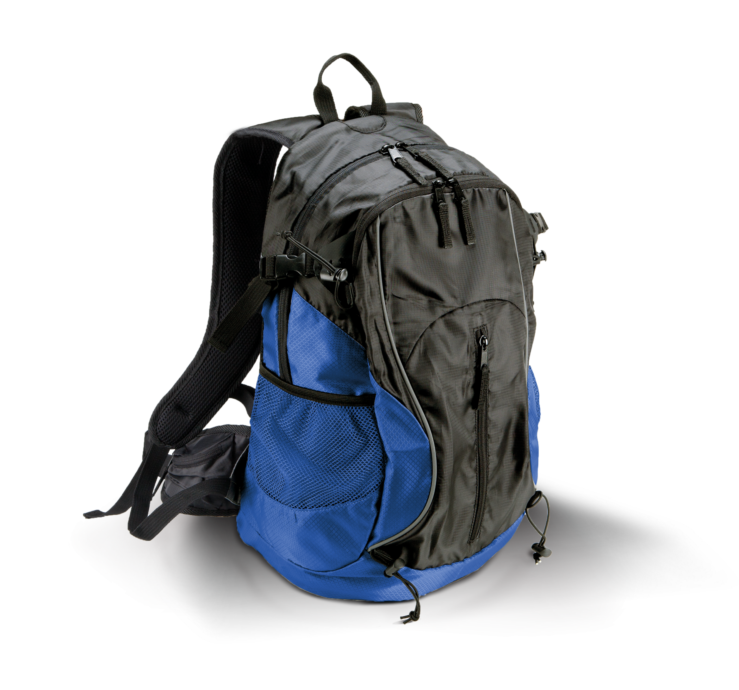 Sac à dos multisports/randonnée en ripstop et polyester alvéolé. 2 compartiments intérieurs, poche zippée devant, poches côtés en filet, équipé d’un élastique porte-béton, bretelles et ceinture ergonomiques, orifice prévu pour poche à eau.