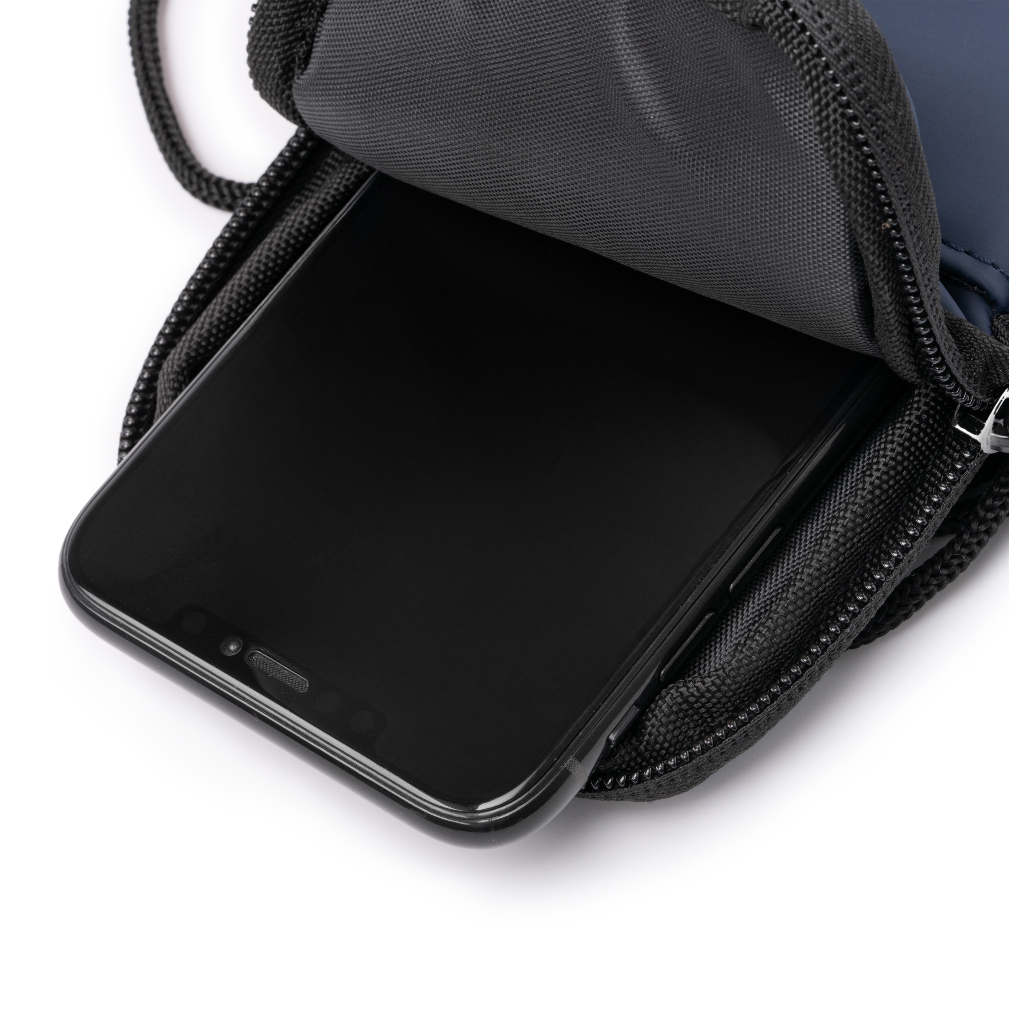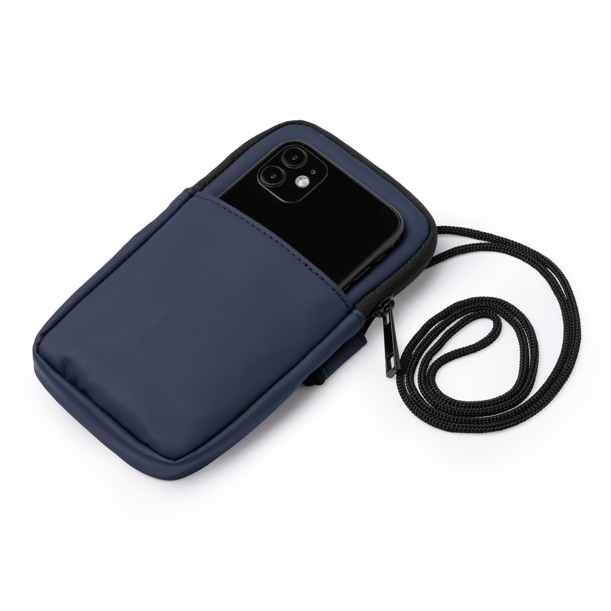 Support de téléphone portable en cuir PU. Compartiment principal avec fermeture à glissière. Poche extérieure et bandoulière de transport réglable.